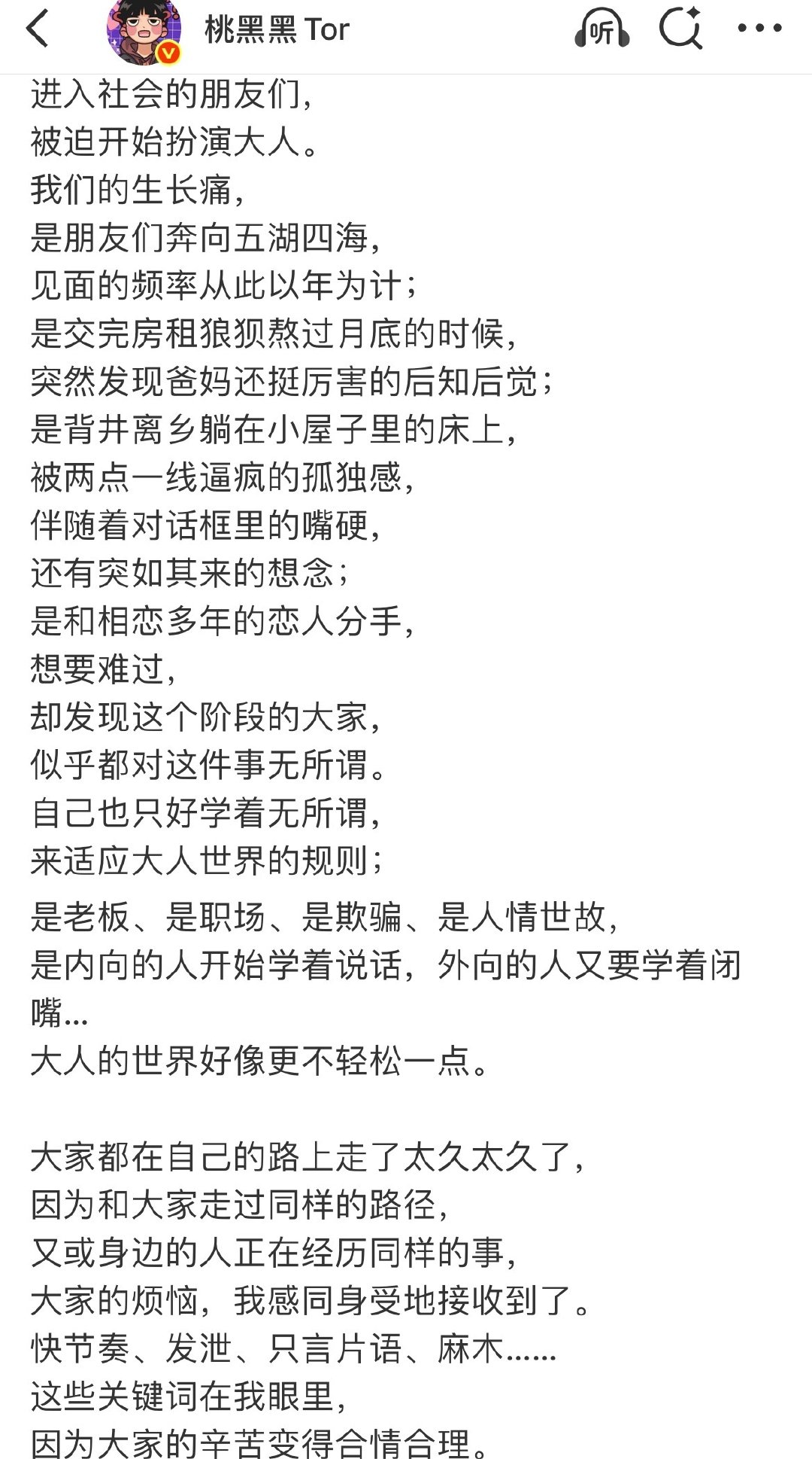 桃黑黑千字长文桃黑黑说错了就是错了 12月5日,发千字长文向粉丝和所有人致谢,并表明自己打算休息一阵,但不会太久,就休息两周。并称:“错了就是错了,做的确实不对的地方,改正就好了,逃避显得愧对大家的善意。既然我已经选择了面对,就是因为我觉得没什么好怕的。有些批评的声音,其实也为这个世界做了很多,不能一概而论,也不能消失。”