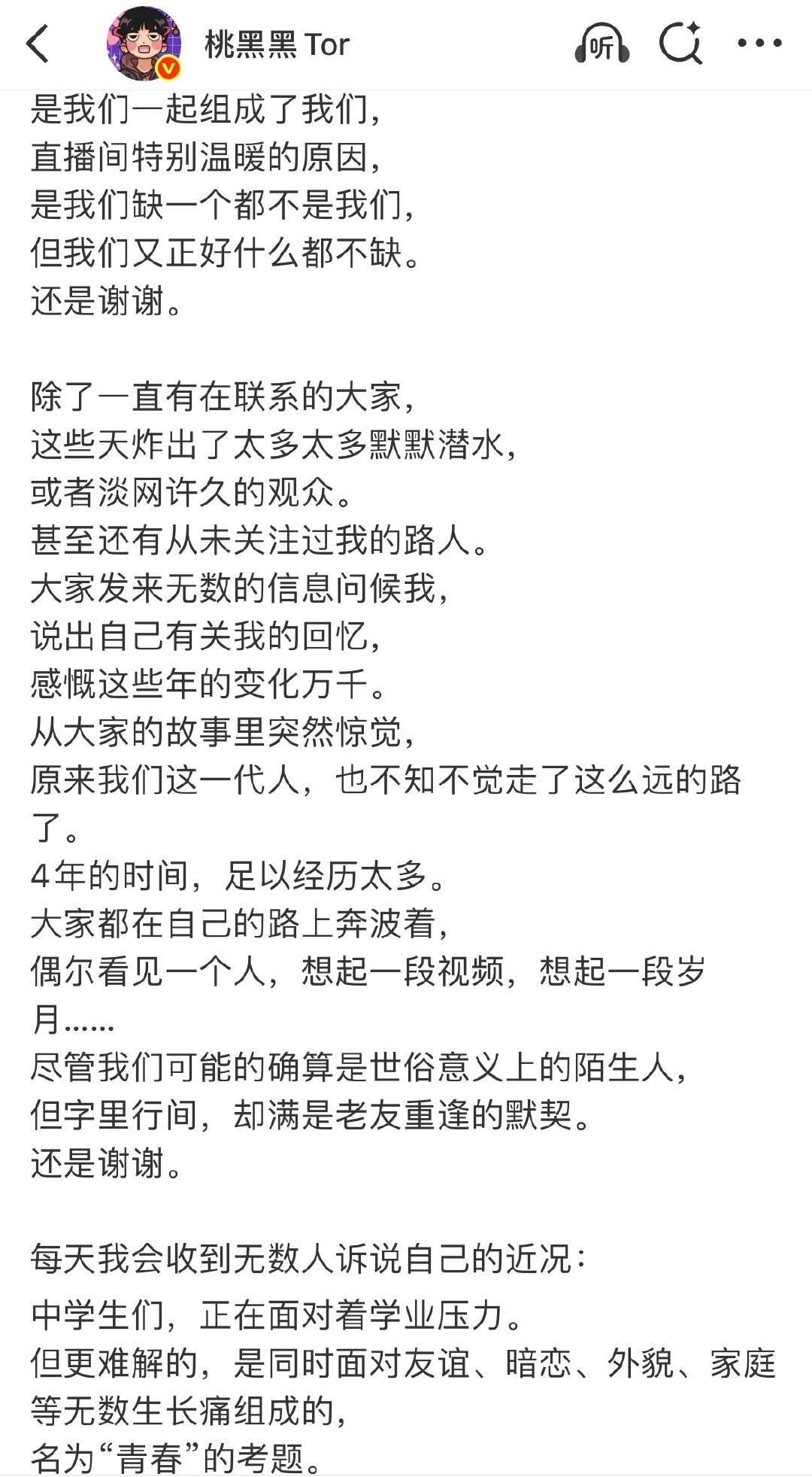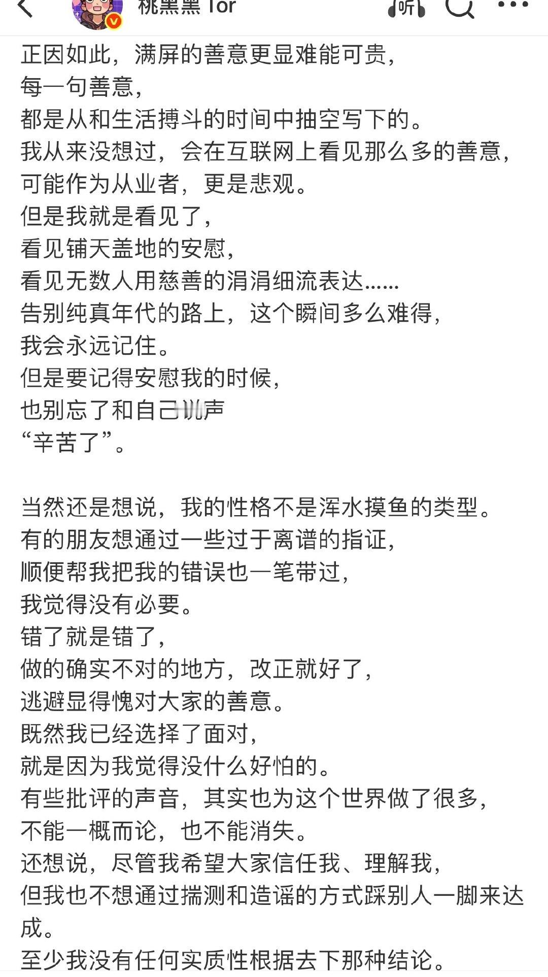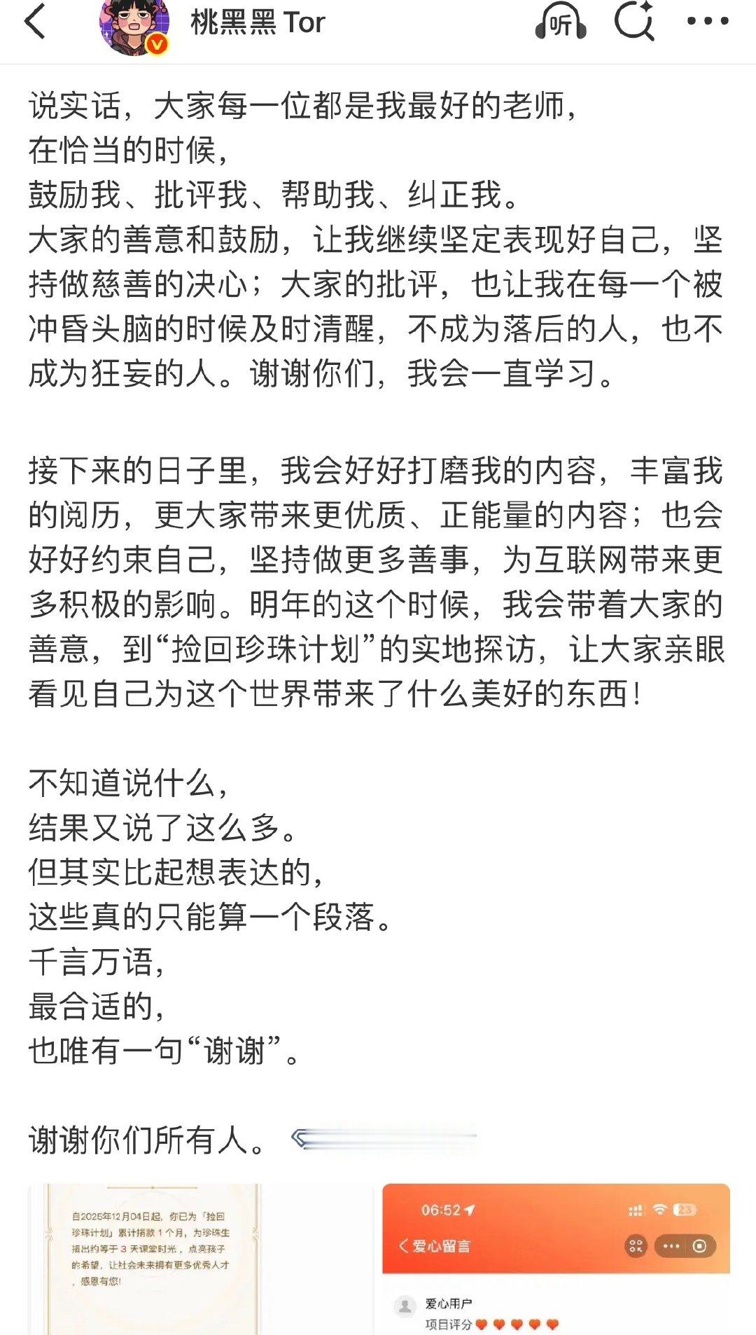 桃黑黑千字长文桃黑黑说错了就是错了 12月5日,发千字长文向粉丝和所有人致谢,并