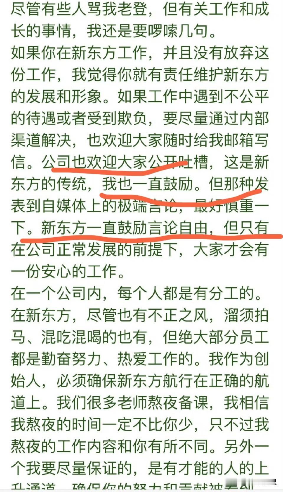 俞总前脚在南极说“鼓励员工公开吐槽”,新东方的一名员工就在公司内部发文吐槽盛行的加班文化。表示入职的时候,劳动合同里清清楚楚写的双休没见过几次,就被困在996的单休循环里,一天工作12个小时是常态,休息时间被严重的侵占。文章刚发完,该员工的账号就被秒封。 员工在维护自己的权益,其实没有错,错就错在把老板的话当真了。现实就是这样,公司要增长,要利润高,往往会以减少员工的个人时间为代价。所以打工人醒醒吧,千万别想着能有人共情你,你的健康和休息,别人不会在意的。职场不讲童话,清醒一点,才能活得久一点。新东方 社会新闻