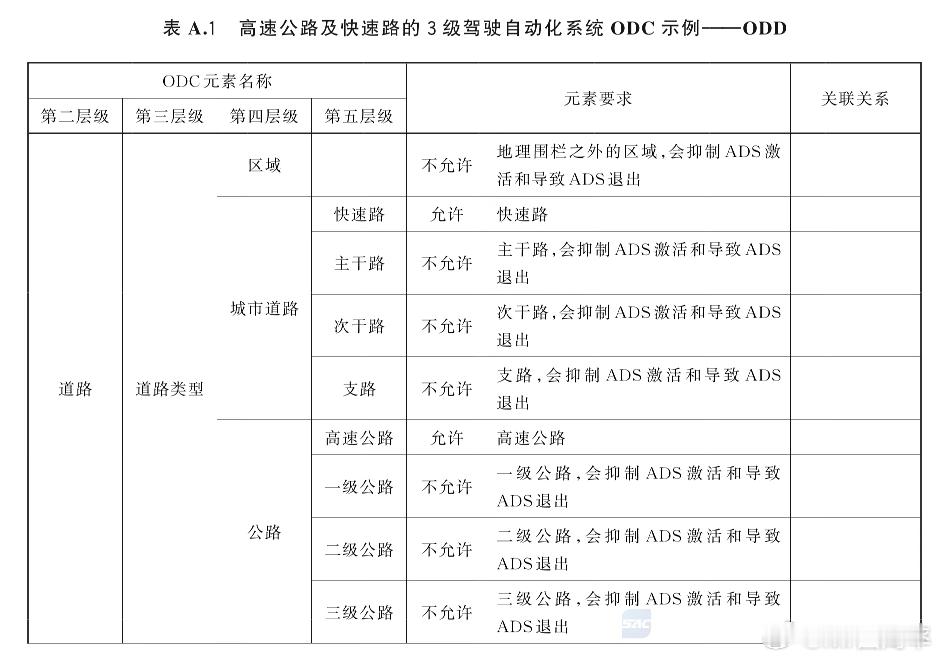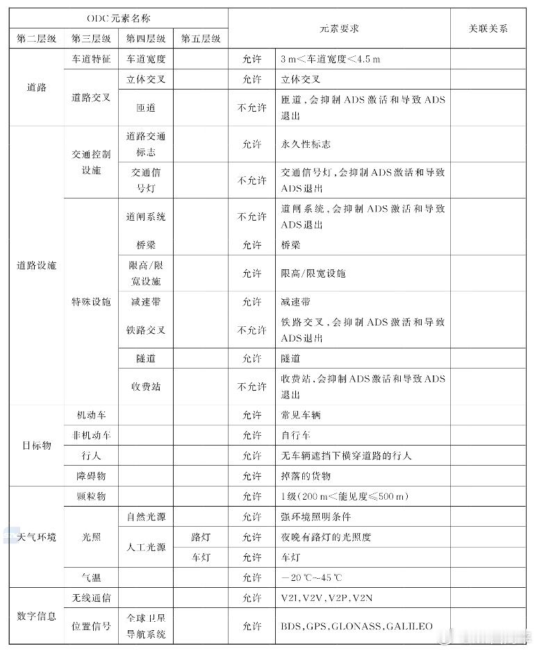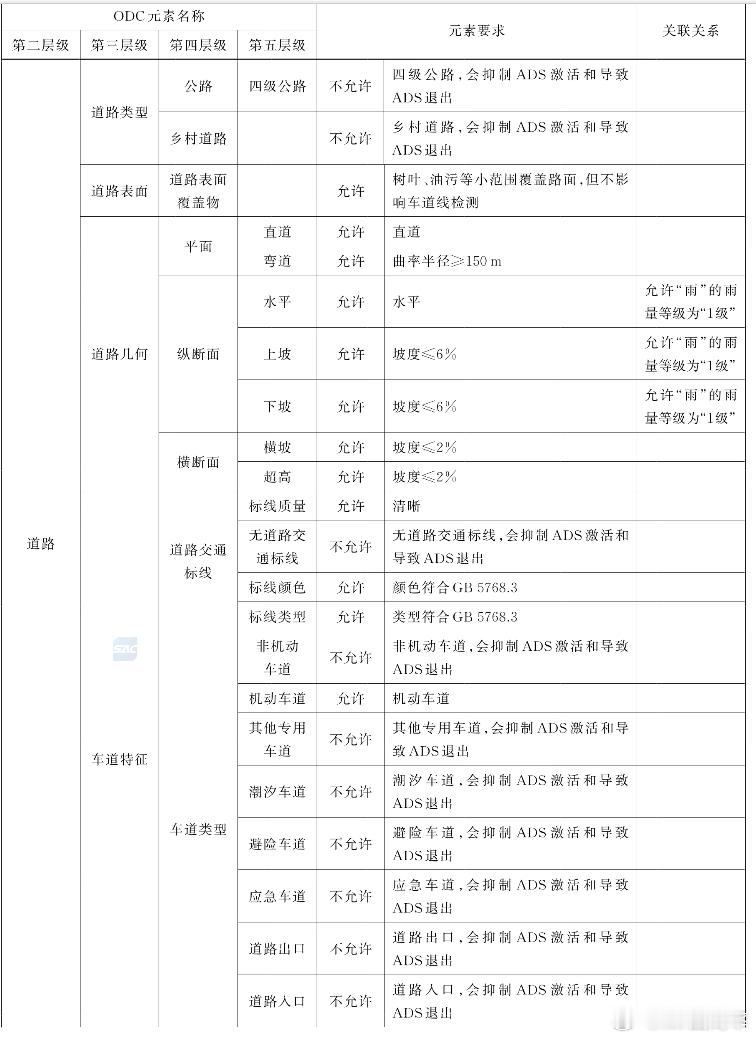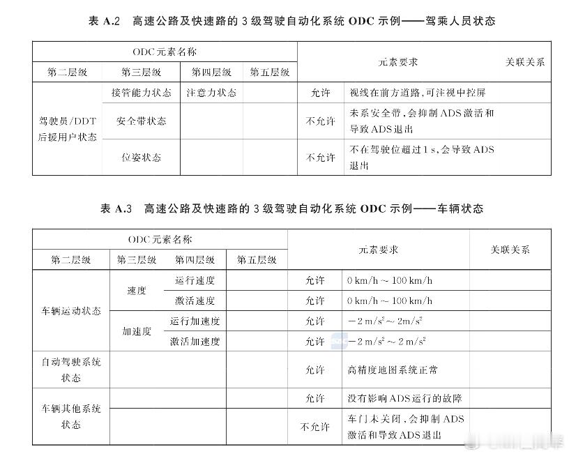 分享一个有意思的国标《智能网联汽车 自动驾驶系统设计运行条件》( GB/T 45312-2025),不过这只是一个推荐国标,没有强制性。这个国标里面的核心内容是用一种具体的参数和属性确定自动驾驶(只有L3及以上)的运行条件(ODC),方便用户可以了解系统的可用范围。着重看看最后一个示例表《高速公路及快速路的3级驾驶自动化系统0DC示例--ODD》就理解了(这个是示例表,不是实际要求,另外里面的ADS是指自动驾驶系统,并不是鸿蒙智行那个ADS系统):图2-图4、ODC的运行范围。图5、驾驶员状态、车辆状态和系统状态。可以看到这个国标能非常清晰的标注系统的ODC(使用条件)和ODD(适用范围),对驾驶员能掌握什么时候能用和不能用还是有一定指引作用,可惜作为一个推荐国标,也没有强制性,后续L3全面铺开的时候不知道会不会有厂家参考这个标准给出提供明确的参数表格大v聊车