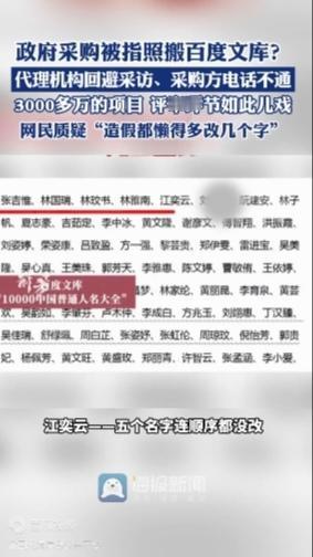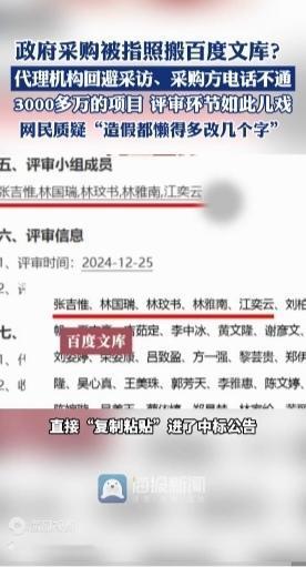 3188万政府采购造假零成本?湖北十堰照搬人名大全的荒诞闹剧 湖北十堰竹溪县一项高达3188万元的机械设备租赁政府采购项目,近日因“偷懒式造假”震惊全网。中国政府采购网12月3日公示的中标公告中,5位评审小组成员名单竟与百度文库“10000中国普通人名大全”前五名完全重合,张吉惟、林国瑞、林玟书、林雅南、江奕云五人姓名及排序丝毫不差,堪称“复制粘贴式公示”。 这场荒诞剧的细节更显离谱:中标供应商竹溪创拓劳务有限公司,一边在《中小企业声明函》中宣称“从业人员1人、营业收入0元”,一边却以“小微企业”身份拿下数千万大单,其21.38亿元的资产总额更是远超微型企业标准2000余倍 。当记者试图求证时,采购代理机构立刻回避采访,采购方电话始终无法接通,唯有官方回应“代理公司上传失误、监管把关不力”的苍白解释。 “这哪是造假,分明是挑衅公众智商!”网友的怒怼道出核心痛点,“连改个顺序、换两个名字的功夫都省了,可见评审流程早成走过场。”更有网友调侃:“百度文库怕是最忙的‘评审专家库’,书法大赛刚抄完,政府采购就接力。” “公共资金不是儿戏,程序正义不是遮羞布。”这场闹剧暴露的何止是工作失误,更是部分基层治理中“制度空转”的沉疴。政府采购本应是阳光工程,却沦为“暗箱操作”的表演舞台;评审名单本应承载责任,却成了随意拼凑的文字游戏。正如评论所言:“偷懒式造假伤的不是面子,是政府公信力。” 目前项目虽已终止招投标,但公众等待的绝非一句“依法依规处理”。唯有彻查背后是否存在利益输送,让失职者担责、造假者受罚,才能堵住制度漏洞,避免“人名大全当评审”的荒诞剧再次上演。造价争议 招标废标 招投标舞弊