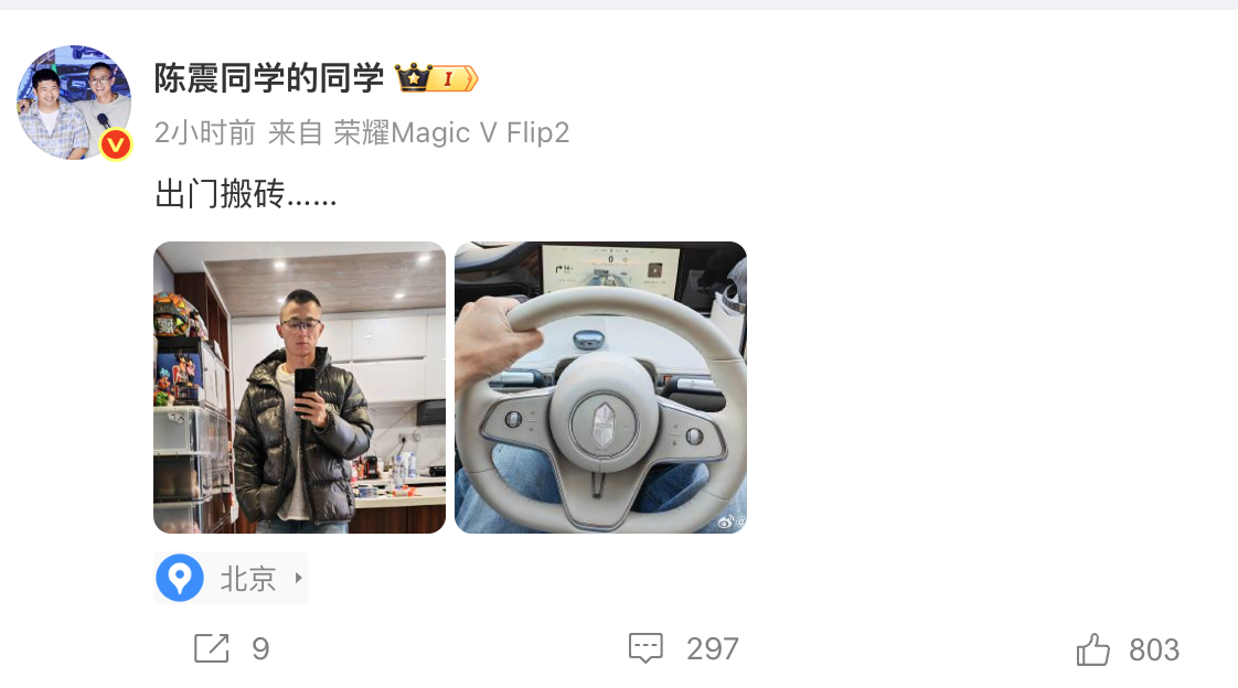 陈震表示要好好反思 在上,陈震表示要好好反思一下。该账号也由陈震运营。