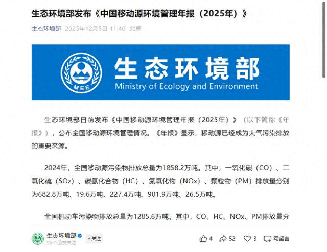 生态环境部日前发布《中国移动源环境管理年报(2025年)》(以下简称《年报》),公布全国移动源环境管理情况。《年报》显示,移动源已经成为大气污染排放的重要来源。