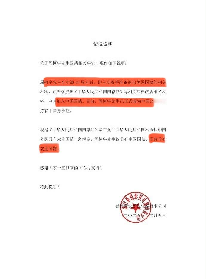 周柯宇工作室回应国籍:“周柯宇18岁后已退出美国国籍,现在是中国国籍,中国公民”