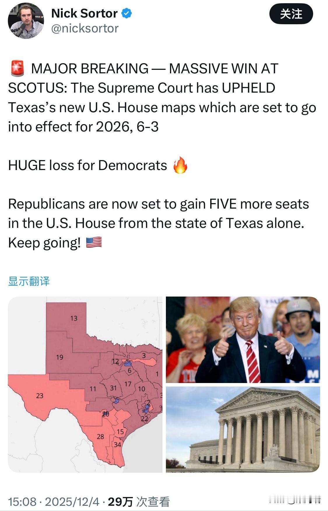重大突发新闻:美国最高法院大获全胜:最高法院以6比3的投票结果维持了德克萨斯州新的美国众议院选区划分方案,该方案将于2026年生效。 民主党遭遇巨大失败! 共和党人现在有望仅在德克萨斯州就再添五个众议院席位。