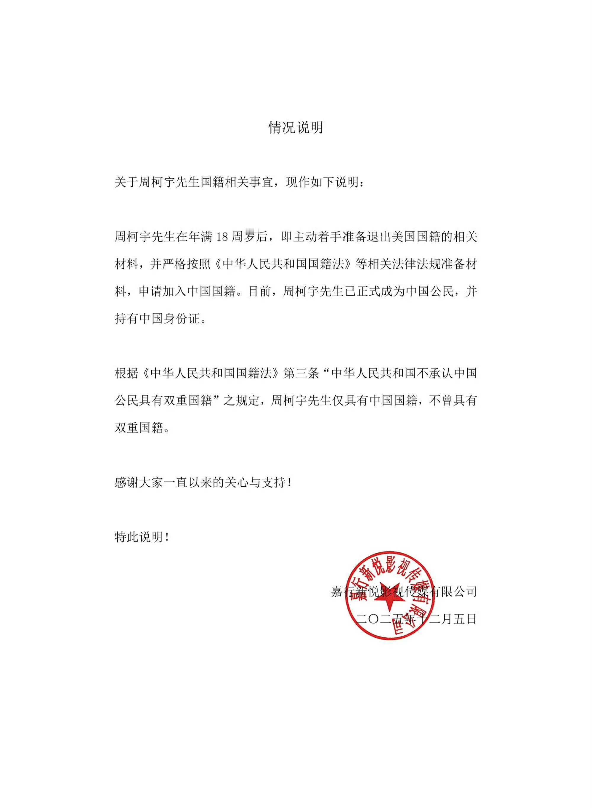 周柯宇发声明,只有中国国籍,没有双重国籍。周柯宇 国籍