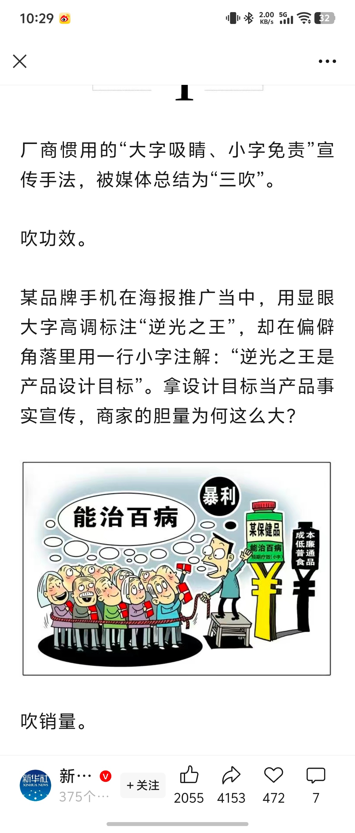 新华社,今日发文痛批:【“大字吸睛、小字免责”,这样的小把戏该退场了!】特别点名批评,一些手机、汽车企业“吹销量、吹功效、吹优惠”把戏,不仅涉嫌虚假宣传和欺诈,有损品牌声誉和消费者信任。“大字吸睛、小字免责”的设计,完全是一种“文字陷阱”,贻害无穷。