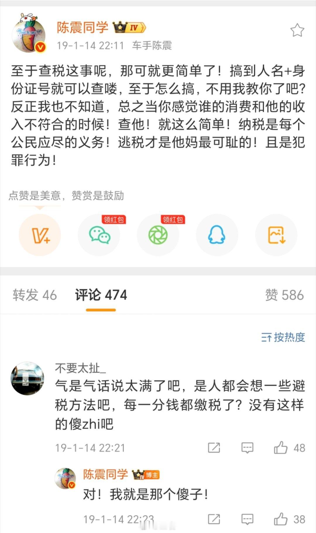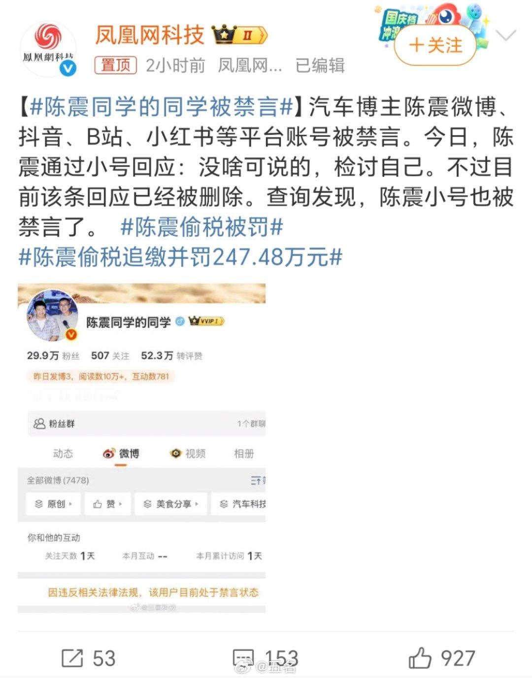 陈震同学的同学被禁言这是一条接着一条……禁言之后又出来偷税漏税陈震偷税案不知道后面出来是继续道歉还是关闭微博可见