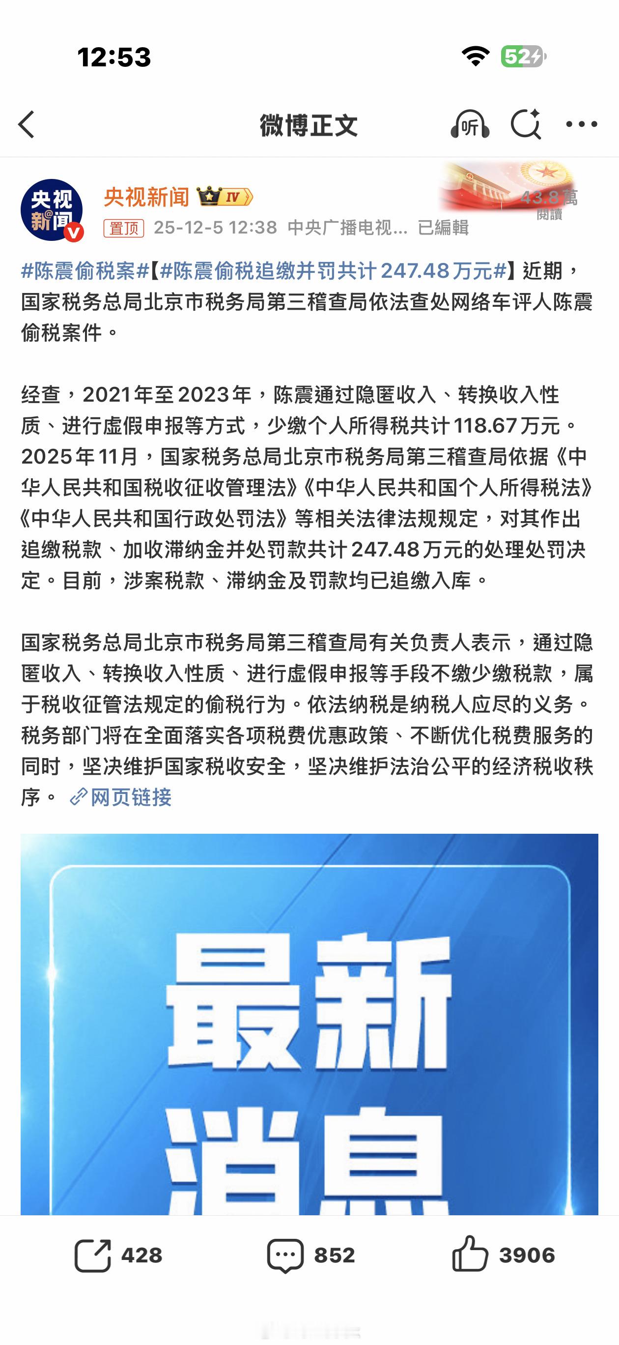 陈震偷税追缴并罚共计247.48万元 陈震牛逼,上央视了,这应该是汽车博主天花板了吧,第一个上央视的