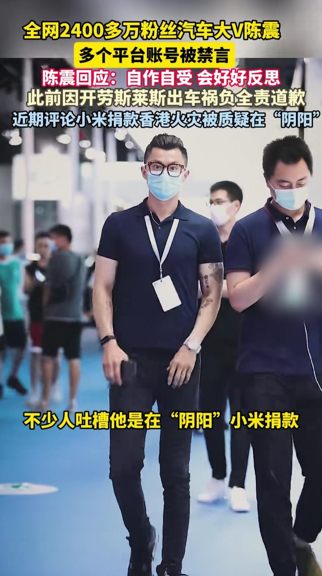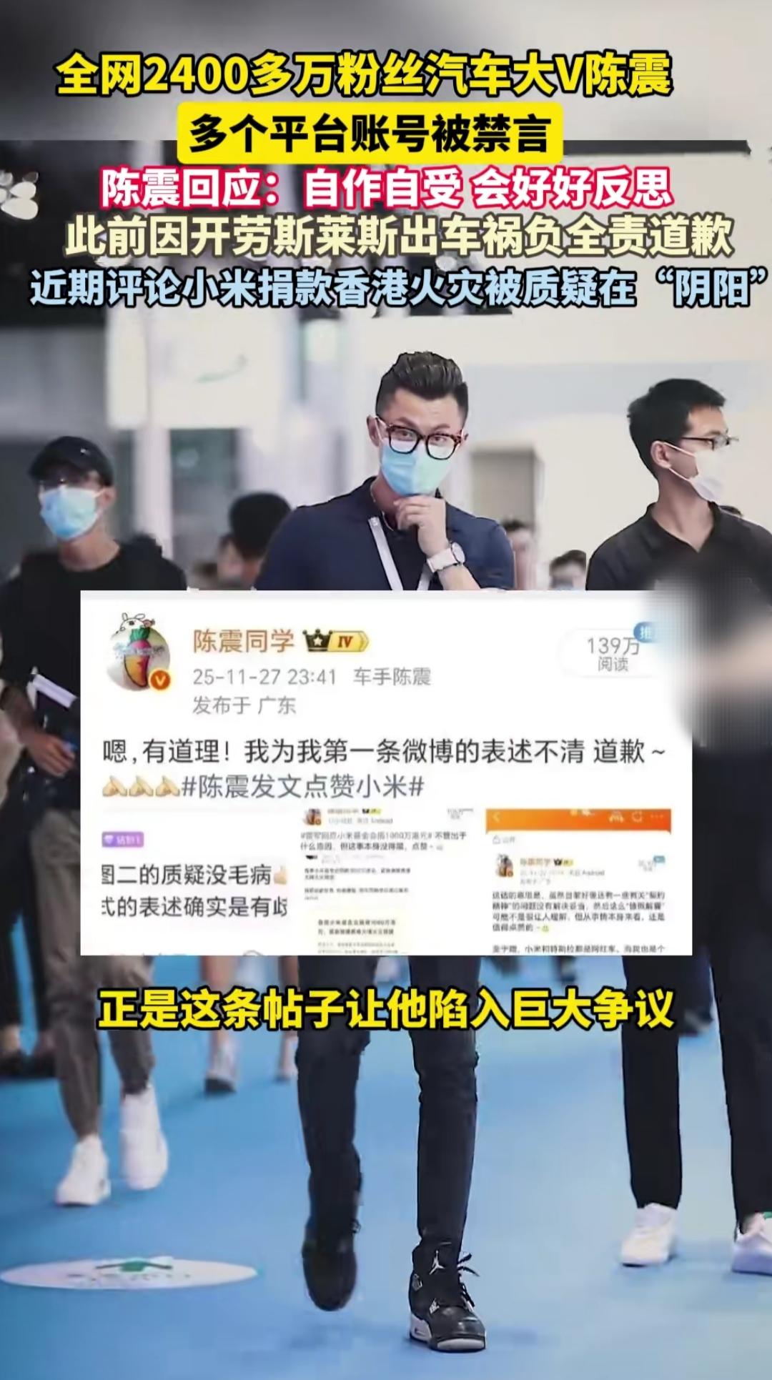 汽车圈突然炸了!2400多万粉的大V陈震,多个平台账号全被禁言,没有前兆没有说明,只留下他一句“自作自受,会好好反思”的回应,网友看了五味杂陈。 其实这不是他第一次出圈,之前开劳斯莱斯出车祸负全责,诚恳道歉后大家选择原谅。可这次评论小米香港捐款被指“阴阳”调侃,直接触碰了大众底线——公众人物的话语权从来不是调侃的资本。 粉丝多不代表可以肆意发言,影响力越大,越要守住言行的边界。无论是车祸还是这次的言论争议,本质都是忘了公众人物该有的责任与分寸。 希望这次禁言能让更多博主警醒,流量终究是双刃剑,唯有真诚和敬畏才能走得长远。