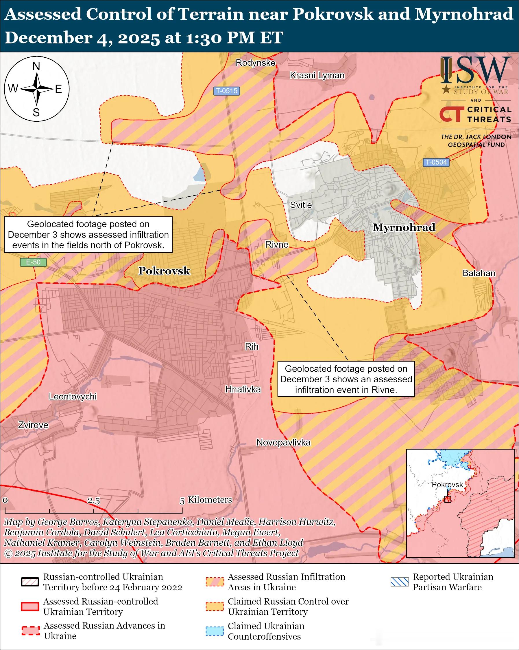 ISW尚未发现任何证据表明俄军已包围米尔诺赫拉德(波克罗夫斯克以东),一些乌克兰消息来源仍然表示,乌克兰军队与波克罗夫斯克和米尔诺赫拉德之间保持着地面交通线(GLOC)。乌克兰媒体Hromadske于12月3日报道称,乌克兰军方人员表示,俄军自11月29日起已包围了米尔诺赫拉德的乌克兰军队,其中一位消息人士称,该地区的乌克兰军队自11月12日以来一直没有轮换。一位消息人士告诉Hromadske,乌克兰解除包围的尝试已取得部分成功。该消息人士还指出,如果乌克兰军队能够夺回切尔沃尼·莱曼(米尔诺赫拉德以北)和罗丁斯克(切尔沃尼·莱曼西北方向),他们就能守住米尔诺赫拉德。乌克兰空降突击部队第7快速反应军发言人弗拉基米尔·波列维上校驳斥了有关俄军包围米尔诺赫拉德的乌克兰军队的说法,并报告称乌克兰军队仍在城内进行轮换和有限的后勤保障。尽管局势可能极其艰难,而且俄军很可能使用火炮和无人机破坏乌克兰狭窄的撤离路线和物流通道,但ISW尚未观察到视觉证据或乌克兰官方报告来评估俄军是否已包围米尔诺赫拉德的乌克兰军队。尽管俄军继续在波克罗夫斯克地区进行渗透行动,乌克兰军队仍在波克罗夫斯克境内开展行动。包括乌克兰总参谋部和乌克兰最高统帅西尔斯基将军在内的乌克兰军方官员于12月4日报告称,乌克兰军队在波克罗夫斯克境内保持存在,甚至控制着该镇的部分地区。12月1日和3日公布的地理定位视频显示,两名俄军在波克罗夫斯克北部行动,另有两名俄军在里夫内中部(波克罗夫斯克和米尔诺赫拉德之间)行动。 12月4日一个在波克罗夫斯克方向作战的乌军旅的发言人报告称,俄军在恶劣天气条件下以两到三人组成的火力小组渗透到波克罗夫斯克北部。发言人表示,俄军指挥部已在波克罗夫斯克-米尔诺赫拉德地区集结了约15万兵力,其中约1.1万至1.2万人正在发动进攻。发言人还表示,俄军无人机给乌克兰的后勤保障造成了困难,但乌克兰军队在过去几天里已成功进行了多次轮换并运送了补给。