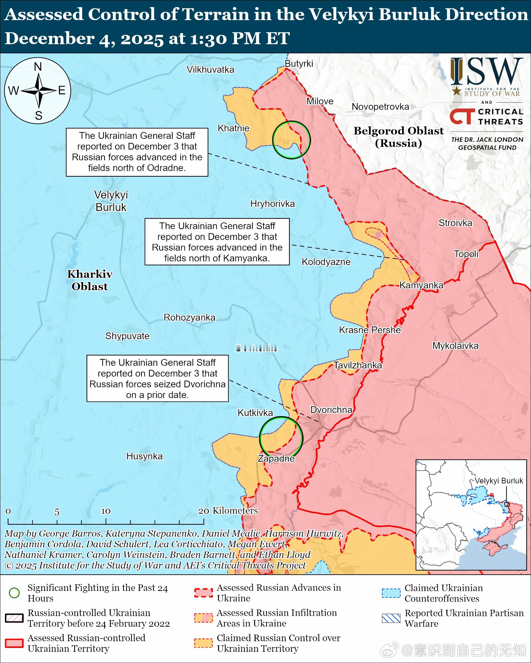 俄罗斯主要行动:乌克兰东部俄军主要行动1俄罗斯的目标:将乌克兰军队从与别尔哥罗德州接壤的国际边界击退,并使其进入哈尔科夫市的火炮射程之内。12月4日俄军继续在哈尔科夫州北部发动进攻,但并未取得确切进展。未经证实的说法:据称与俄北方部队集团有关联的一位军事博主声称,俄军已推进至伊兹比特斯克北部(哈尔科夫市东北部)。另一位军事博主声称,俄军已推进至维尔恰北部(哈尔科夫市东北部)。俄罗斯声称占领的区域范围:12 月 4 日发布的地理定位视频显示,乌克兰军队在沃夫昌斯基胡托里西部(哈尔科夫市东北部)保持阵地并取得进展——此前俄方声称俄军在该地区驻扎。12月3日和4日,俄军在哈尔科夫市东北部的沃夫昌斯克、维尔恰、莱曼、普里利普卡、锡涅尔尼科韦和斯塔里齐亚附近以及伊兹比茨克方向发动进攻。俄罗斯军事博客作者声称,乌克兰军队在维尔恰附近进行了反击。12月4日在沃夫昌斯克方向作战的乌军旅发言人报告称,俄军正在对乌克兰阵地进行炮击、空袭、TOS-1A温压炮打击以及“伊斯坎德尔”弹道导弹攻击,以支援俄军地面部队夺取沃夫昌斯克的行动。该发言人补充说,俄军同时使用了光纤无人机和常规无人机。发言人指出,俄军继续采用小股渗透战术,并且俄军第一波进攻行动中包括前战俘。发言人报告称,俄军在该地区定期举行升旗仪式,以支持其在结束战争谈判背景下夸大的俄军进展——这一说法与ISW的持续评估相符,即俄军指挥部正在前线各地进行高调的升旗仪式,以支持其夸大的俄军进展,这是认知战的一部分,旨在将俄军战场胜利描绘成不可避免的。12 月 3 日发布的视频显示,乌克兰军队使用 GBU-62 联合直接攻击弹药增程型 (JDAM-ER) 制导炸弹袭击了沃夫昌斯克的一个俄罗斯无人机控制点和通信枢纽。据报道一位与俄北方部队集团有关联的军事博主于 12 月 4 日声称,伊兹比特斯克附近的森林地形减缓了俄第 7 摩步团(第 11 军,列宁格勒军区)在该地区的进攻速度。战斗序列:据报道俄第 245 摩步团(第 47 坦克师,近卫坦克集团军 [GTA],莫斯科军区 [MMD])的炮兵部队继续向哈尔科夫方向作战。俄军最近向大布尔鲁克方向推进。评估俄军的推进:乌克兰总参谋部于 12 月 3 日发布了一张地图,显示俄军向奥德拉德内以北、格里戈里夫卡以东(均位于大布尔卢克以东)推进,向卡缅卡以北、德沃里昌斯克以东(均位于大布尔卢克东南)推进。12月3日和4日,俄军从韦利基布尔鲁克东北部的安巴尔内、米洛韦和哈特涅附近以及韦利基布尔鲁克东南部的德沃里昌斯克附近向科洛迪亚兹涅方向发动进攻。