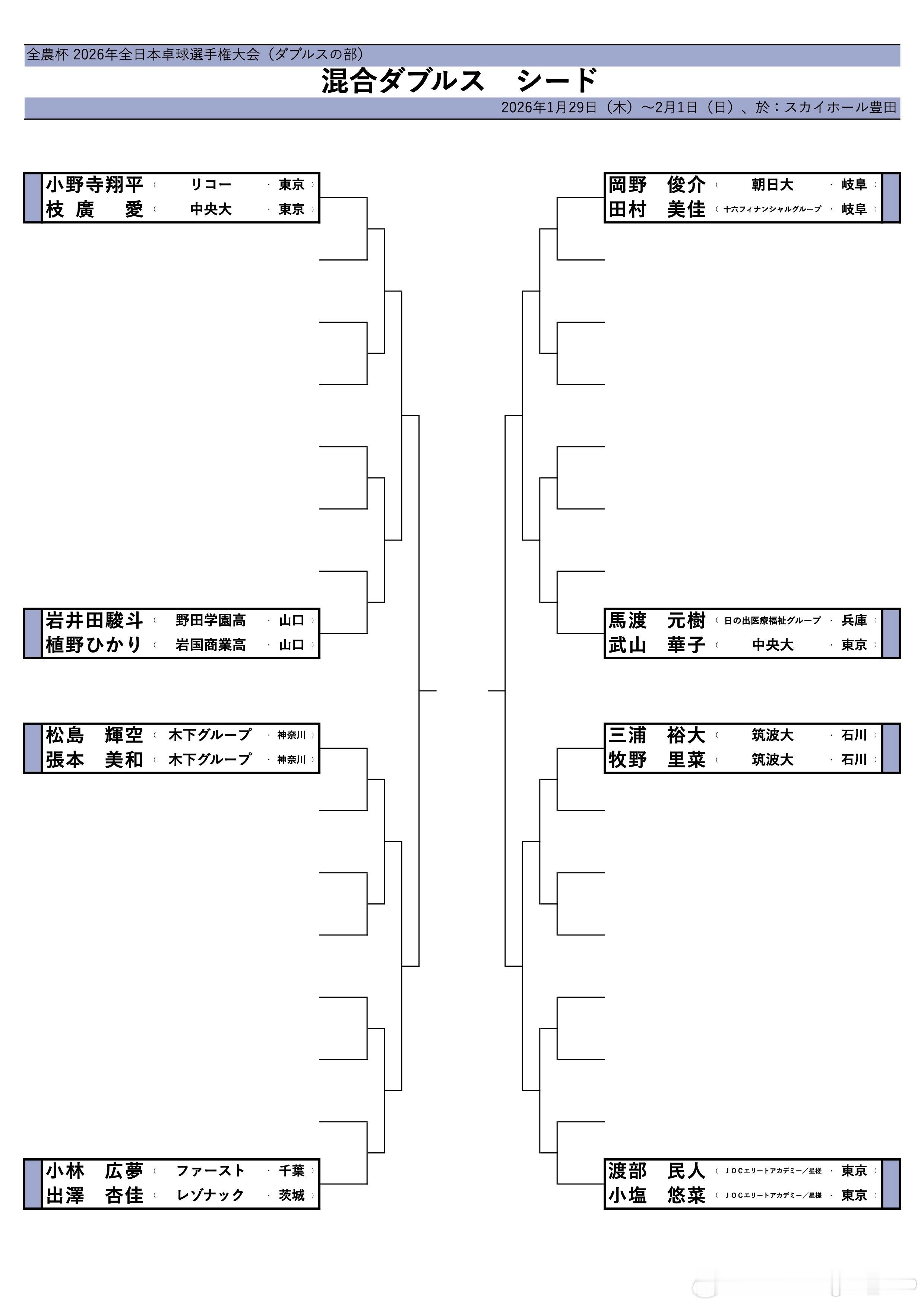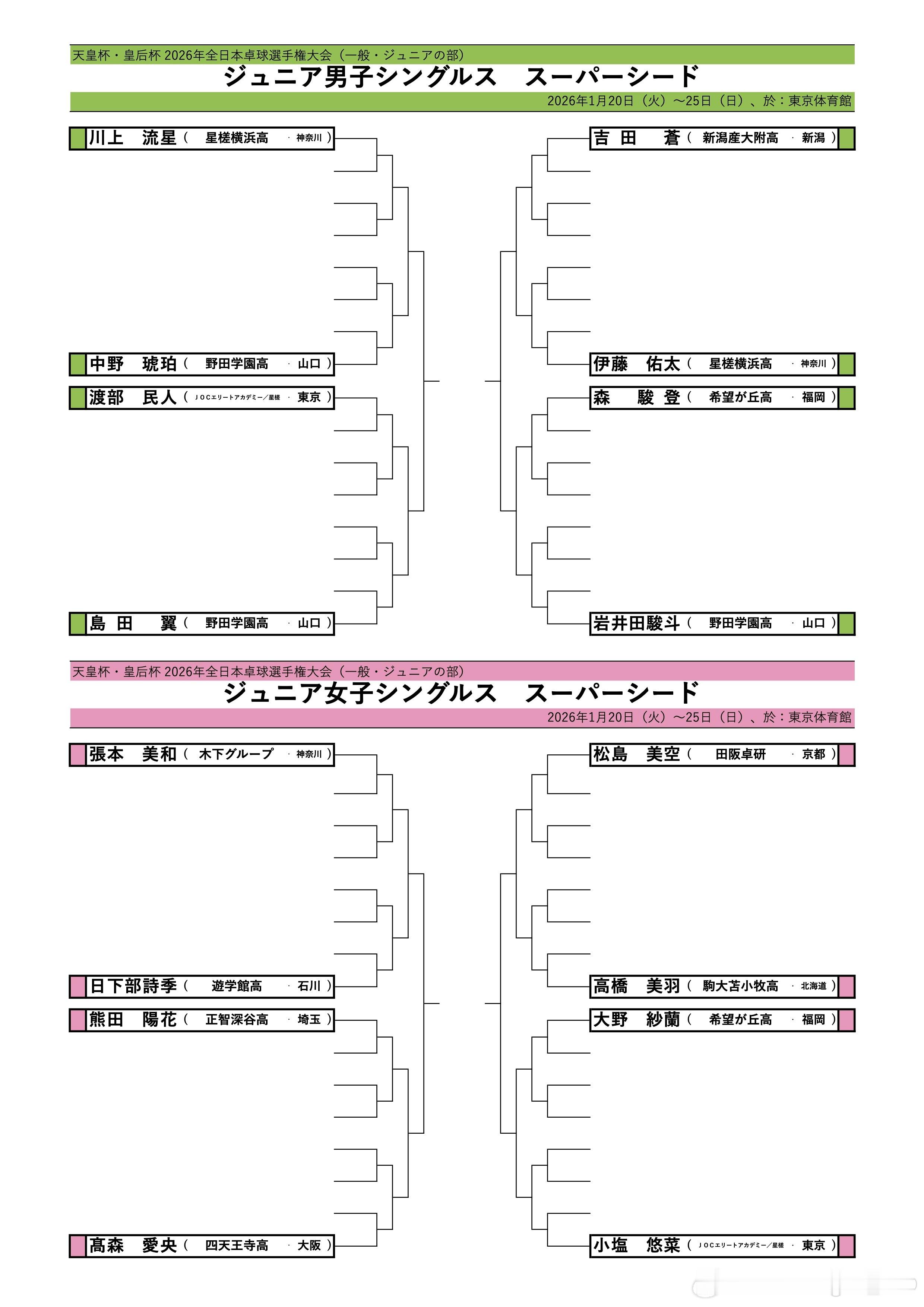 2026年全日锦 双打种子签表女双:平野美宇/木原美悠、大藤沙月/横井咲樱男双:篠塚大登/谷垣佑真混双:张本美和/松岛辉空2026年全日锦 青少年组单打种子签表(美和还参加了