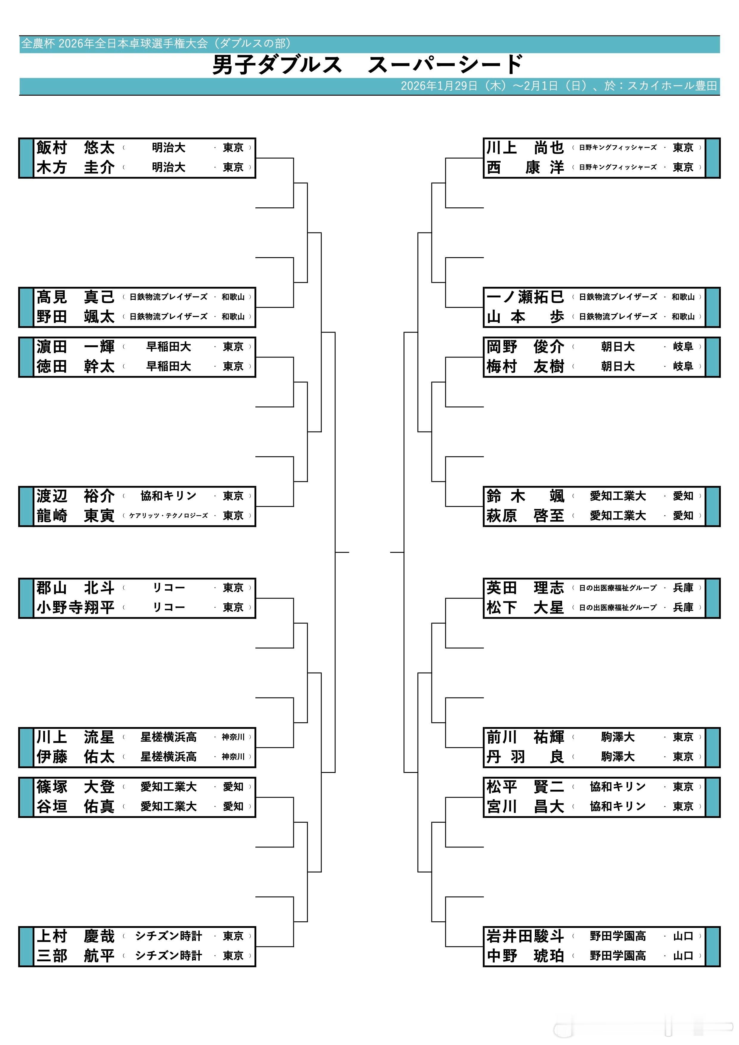 2026年全日锦 双打种子签表女双:平野美宇/木原美悠、大藤沙月/横井咲樱男双: