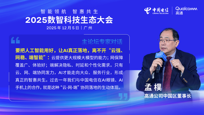 从高通公司的角度来看,要让ai真正能在终端普惠落地,离不开“云-网-端”协同发展。要推动ai的规模化发展,既离不开像中国电信这样的网络运营商,也离不开云服务商和终端厂商。终端侧ai、边缘智能与云之间的协同发展,正成为推动ai发展的重要趋势。