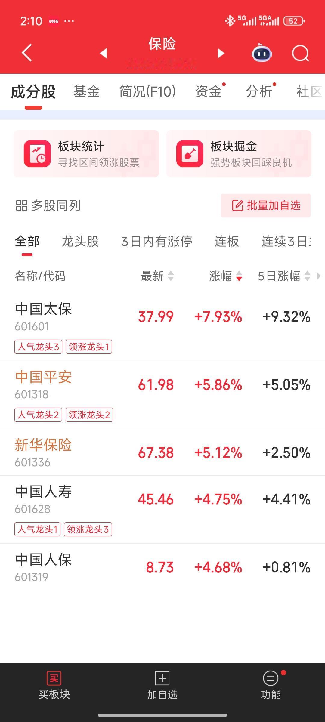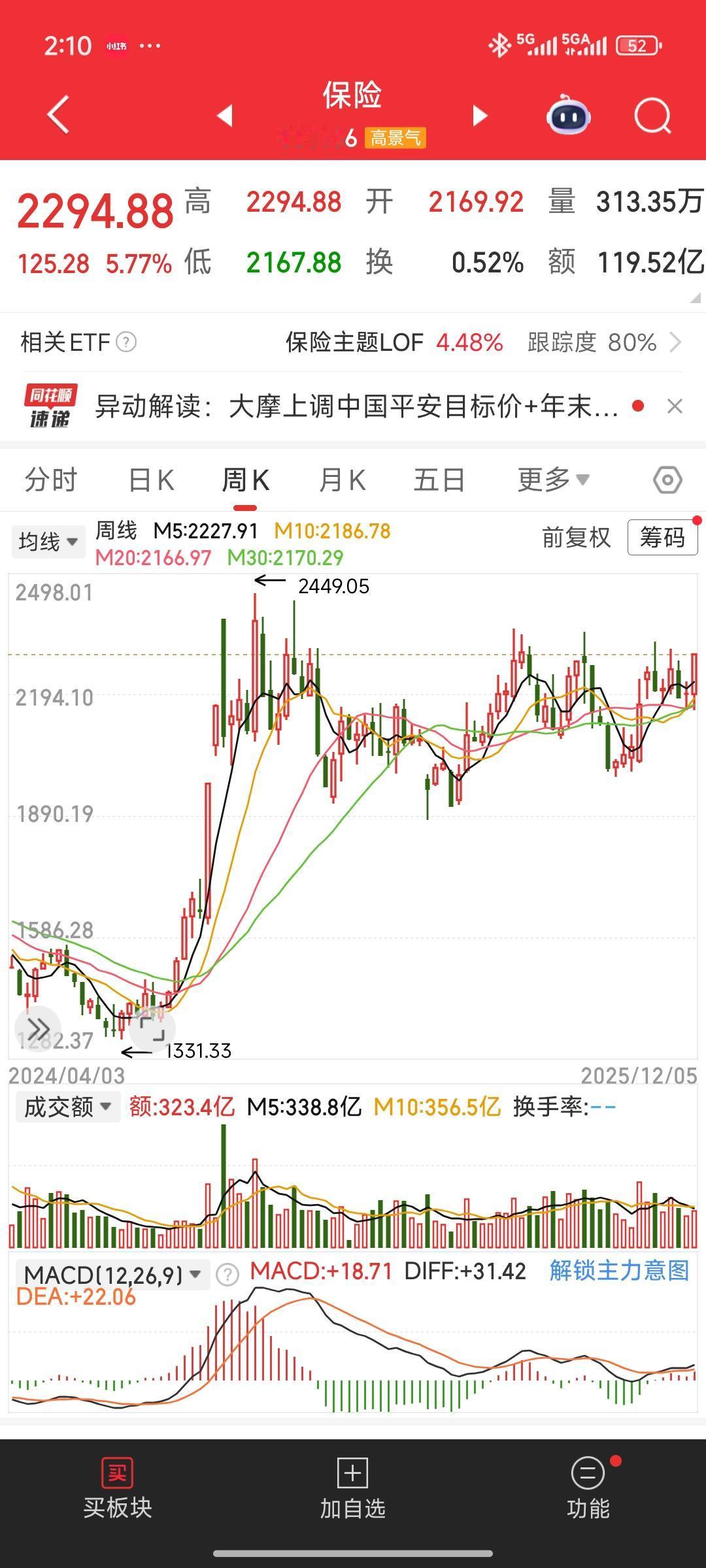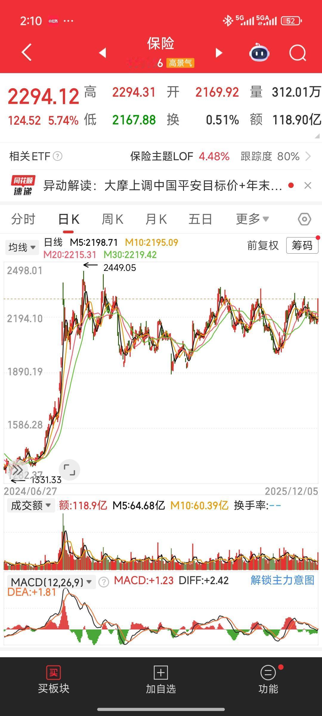 今日午后,大金融板块中,保险与券商开启放量大涨模式。尤其值得关注金融板块里的保险板块,其走势相当亮眼。我认为,保险板块表现出色,且在牛市中是最为受益的板块。大家应积极关注保险板块,可考虑分批买入,或者直接买入保险ETF。 你对现在的股市有何看法? A股:未来趋势何去何从? 如果抄底的话,如何选择券商股票 目前能持仓券商股票吗 上联:老屋依旧在,如何对下联 个人投资a股,可以稳定战胜大盘吗 股市,该有门户之见么? K线大趋势中为何底部是逐步抬高的 为什么买券商股一定要买大券商?