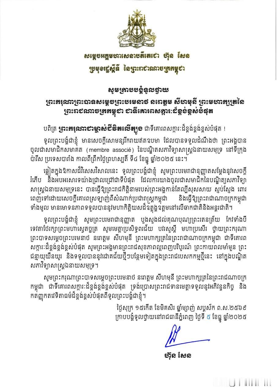 柬埔寨这两天有个大喜事:国王陛下当选法国巴黎海外科学院院士,洪森亲王的祝贺,是全柬埔寨上下的共同心声。 这科学院在国际学术圈是“权威殿堂”,院士头衔是对学者终身成就的最高褒奖——不是随便有成绩就能拿的。国王这些年一直守着咱的文化遗产,还把柬埔寨学术推到世界舞台,这次当选,是全世界认了他的本事和眼光。 洪森这声祝贺不只是“恭喜”,更能看出政府和王室一条心,都在给国家争脸面。这对年轻人也是鼓劲儿:国王都这么拼,咱柬埔寨的年轻人肯定更愿意钻学术、护文化。 这事儿不光是国王的荣光,还让柬法文化科技交流更热络,也让世界看到咱柬埔寨既有历史根脉,又有现代活力。这院士头衔,是国王的骄傲,更是柬埔寨走向世界的新名片。
