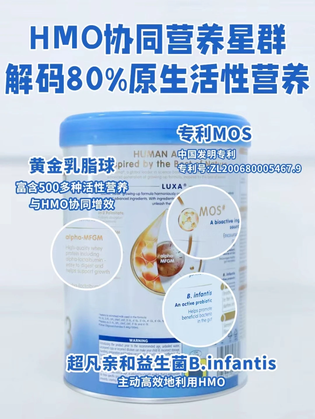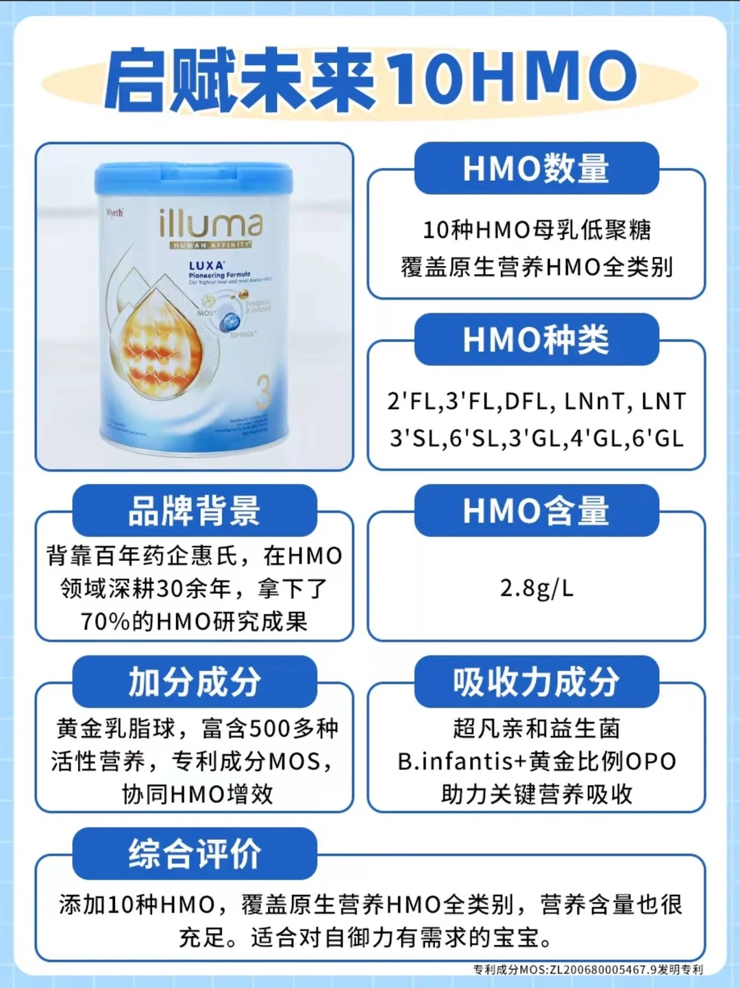 启赋未来10HMO:富含500多种活性营养的黄金乳脂球搭配专利成分MOS(ZL200680005467.9发明专利),协同HMO增效