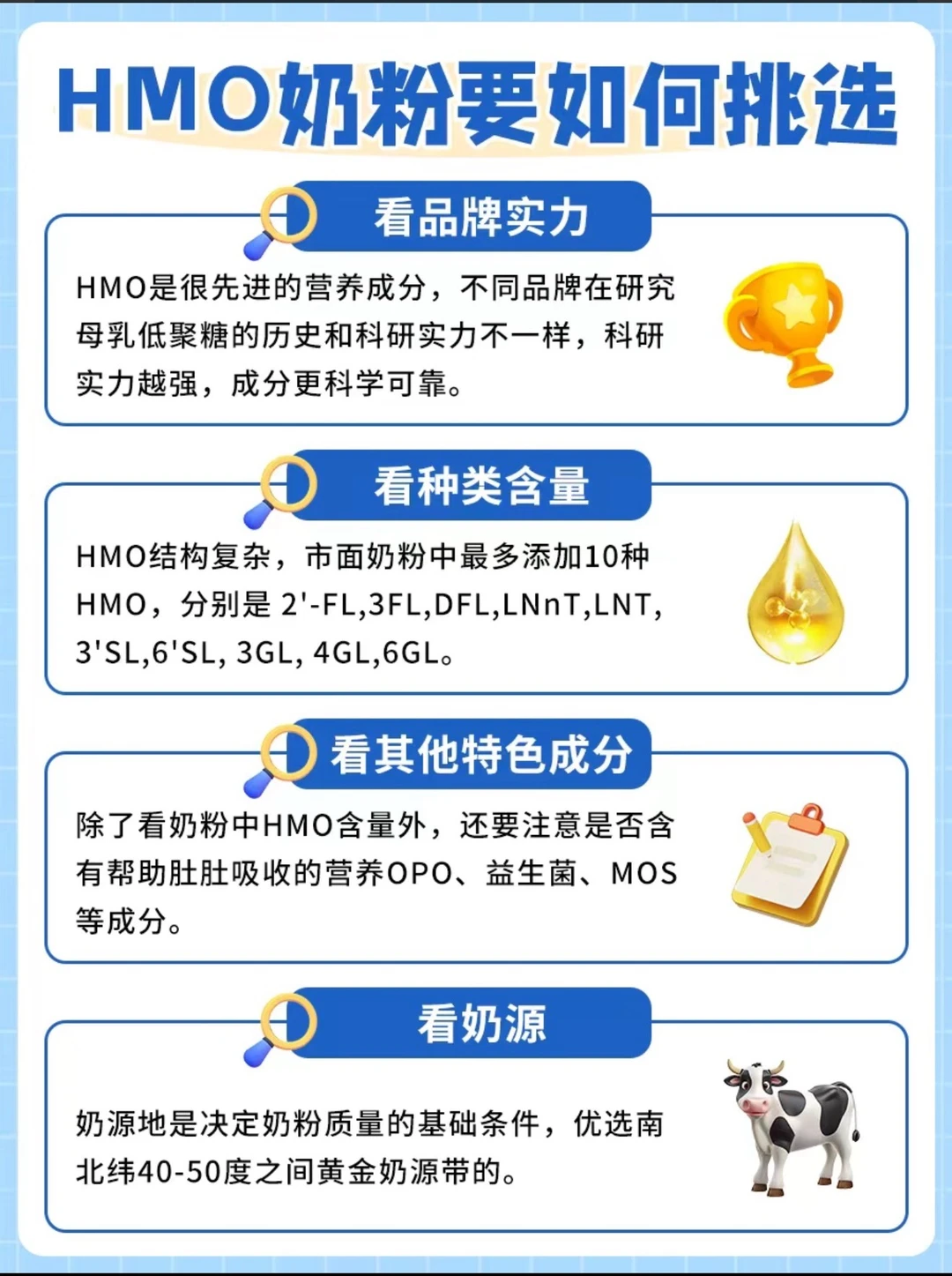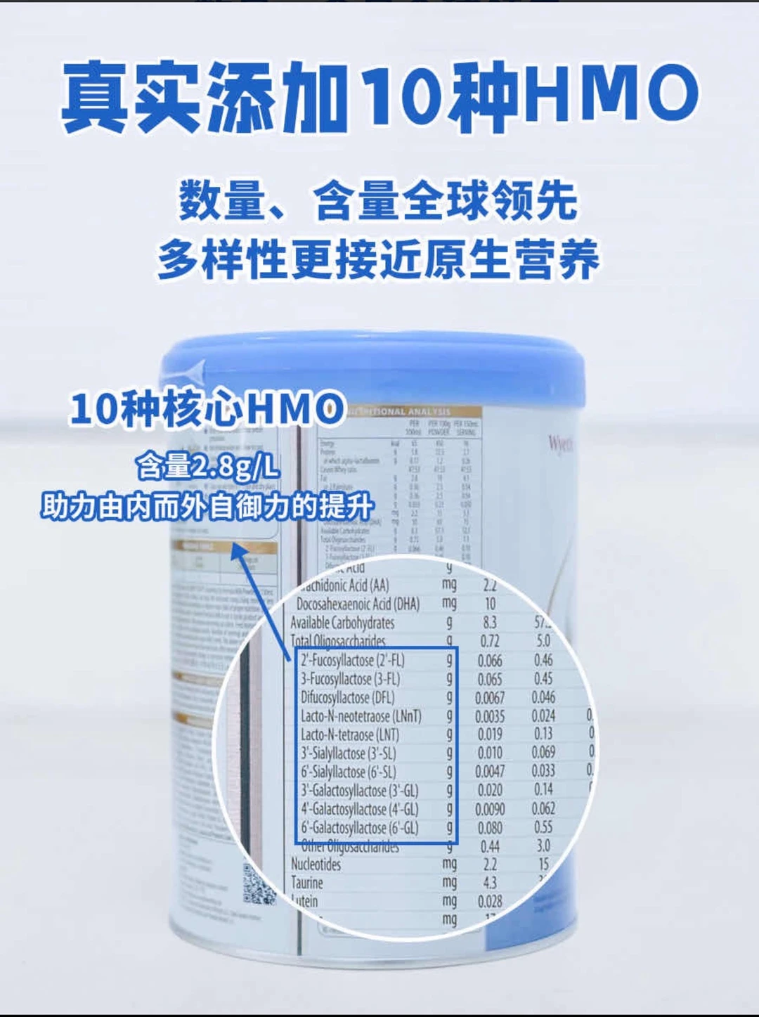 启赋未来10HMO:添加了10种HMO (2'FL,3-FL,DFL,LNnT,LNT,3'SL,6'SL,3'GL,4'GL,6' FL)覆盖原生营养中HMO全类别,都是真实添加,较旧版提升6倍。数量含量双双登顶,全面帮助自御力提升