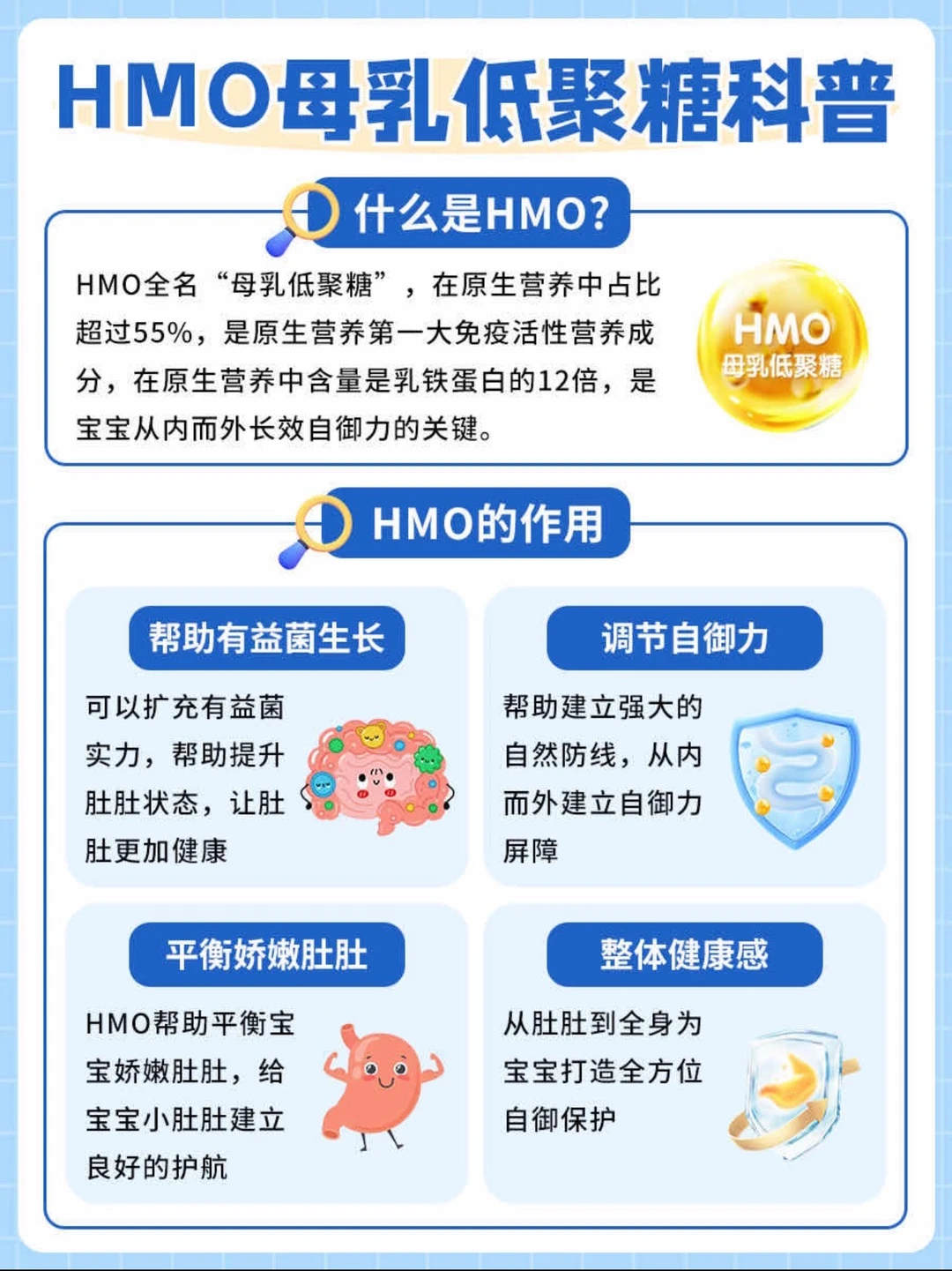 妈妈们可以选择HMO奶粉喂养,因为HMO母乳低聚糖是原生营养中的第一大活性营养成分,不仅能呵护宝宝玻璃肚,还能给宝宝搭建自御屏障。