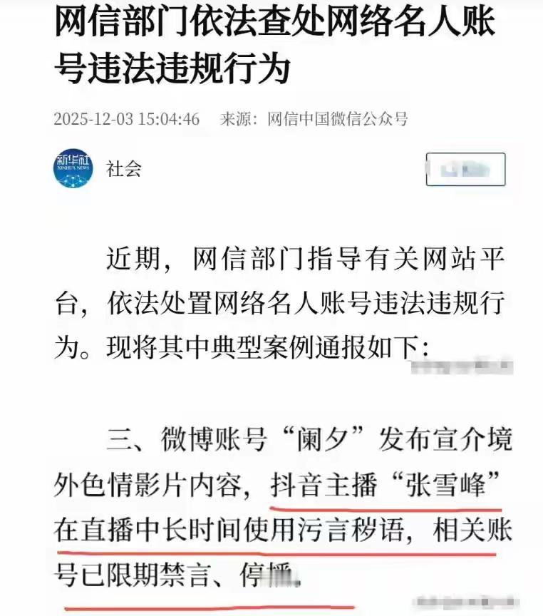 顶流网红张雪峰因直播长时间飙污言秽语,遭国家网信办点名通报,相关账号被限期禁言停播。此前他还陷“言行不一”“私生活争议”风波,靠考研指导走红后膨胀失度,无视观众信任触碰底线,这场处罚也为流量网红敲响守规警钟。 网友评论: 张雪峰对国家无害,对社会无害,对百姓无害。黑张雪峰的人一定别有用心。 他帮助了底层百姓因为信息不对等造成的选择专业错误,帮助了许多家庭,但是,这也阻碍了一些利益阶层,社会就是这么残酷,愿好人好报 老百姓还是认可张雪峰的,拿下张雪峰是因为他动了大多数人的蛋糕。 黑张的人就是居心叵测! 张都是为穷人说话,黑张的肯定是富人的既得利益者! 那个什么说:千万不要忘记阶级斗争!
