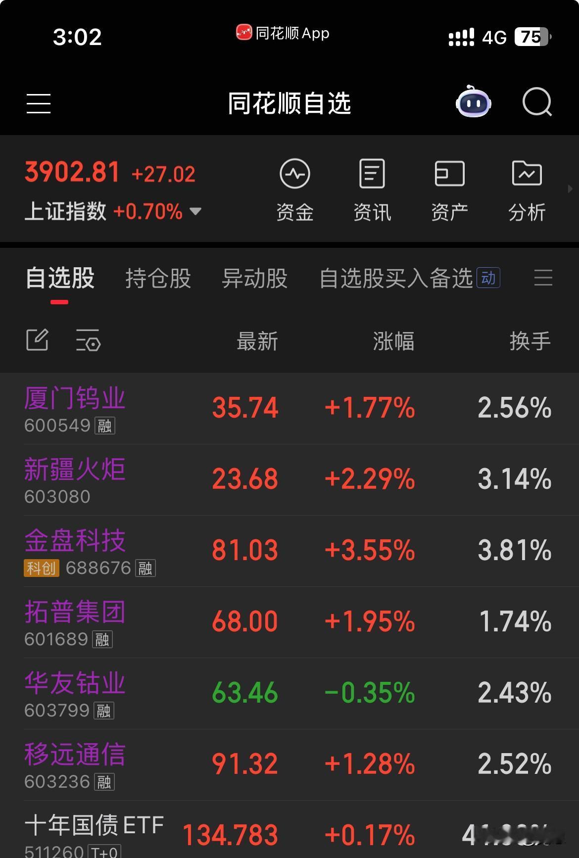 大盘下午强势啊!出乎我的预料之外。 忙不迭的加仓。火炬买了冲上去了,其他华友,金盘,厦门钨业下午买入都没赚到。手续费倒是不少[捂脸]。收盘利润一般,红了1800,4成仓。今天操作也是一般,还是心态不稳定。