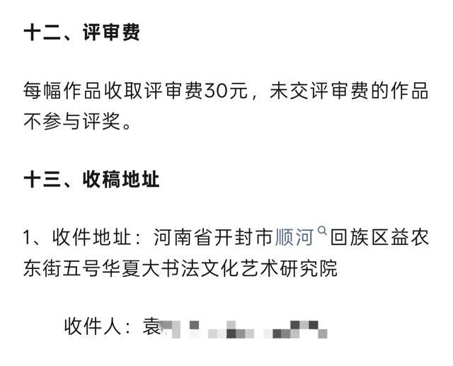 该大赛征稿启事显示,主办单位为华夏大书法文化艺术研究院,承办单位为朔州市考级基地和开封八古书画院有限公司。收稿地址为河南省开封市顺河回族区华夏大书法文化艺术研究院,收件人为袁某。记者查询了解到,开封八古书画院有限公司成立于今年7月,法定代表人也是袁某,注册地同样位于开封市顺河回族区。