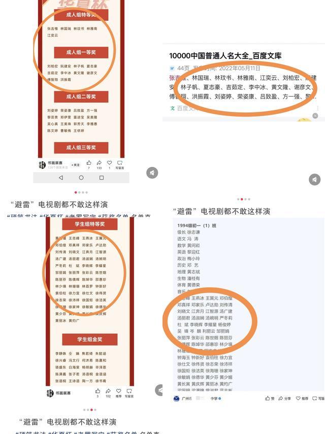 网民发布的帖子内容显示,该比赛设置了成人组特、一、二、三等奖以及学生组特等奖、金奖等奖项,并公布了获奖名单。但是这些获奖者姓名却与某文库2022年发布的《10000中国普通人名大全》和某中学公布的上世纪90年代学生花名册重合,引发热议,有人认为此举有造假、骗钱之嫌。