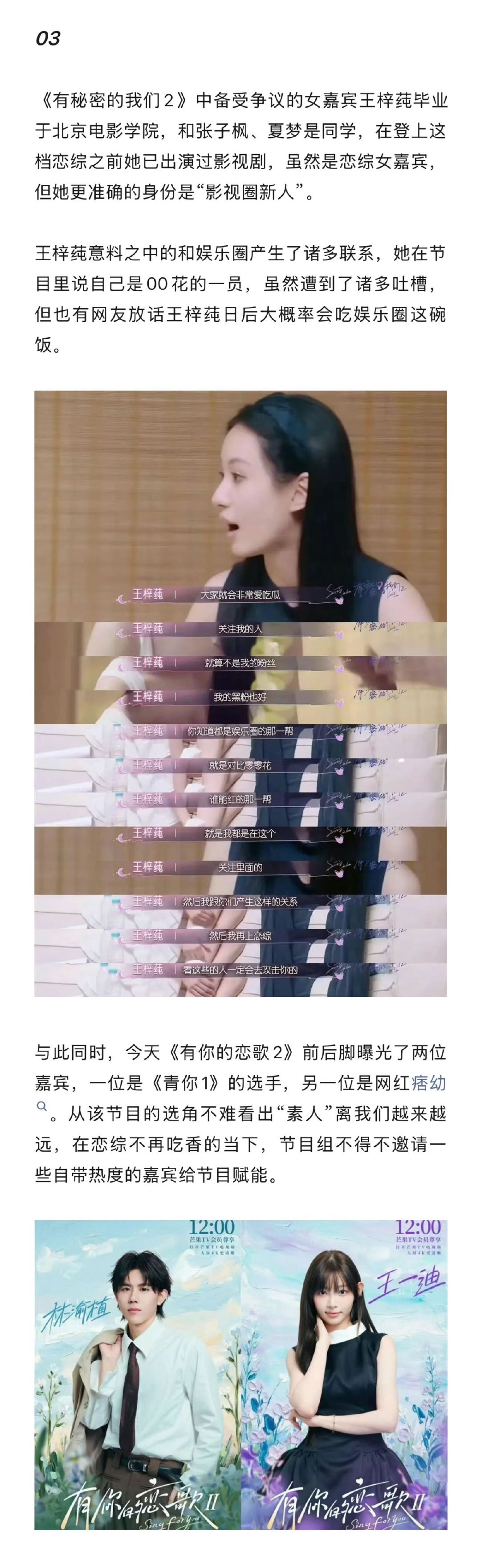 恋综是通往娱乐圈的大门吗业内谈恋综选角标准 从无人问津到靠争议走红,《有秘密的我们2》王梓莼备受争议,侧面印证了恋综嘉宾才是流量密码。业内人士爆料,内娱恋综早年照搬韩版《Heart Signal2》,高颜值、海归学历、中产职业成选角三大硬指标,嘉宾面试甚至会刻意穿最贵行头迎合标准。而CP感全凭“玄学”,带“伤痛气质”的嘉宾更受青睐,如今为博热度,网红、明星预备役扎堆恋综,素人恋爱早已变味。