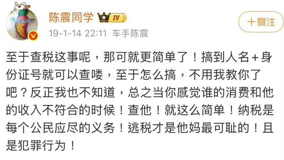 坐拥2400万粉丝的车评人陈震,几年前口口声声说自己每一分钱都交税,竟然也被查实几年来偷税118.67万元! 但100多万对于陈震来说,感觉不至于啊。 2400 万粉顶流、单条广告 80 万,流量这么大,光微博流量共享一天都能赚几千了吧?更别说抖音还有一千多万粉丝,却靠隐匿收入偷税。 247万的代价对个人而言不小,但对公众而言,意义远超数字本身。 其本人用小号回应称:“自作自受…会好好反思”,之后,其小号再度被平台禁言。 早上其小号还发视频说不知道全网被封的原因,现在官方直接说是偷税漏税,而且补缴完毕了,说明早就知道被封的原因。 央视点名,也是对早晨小号发视频的重锤吧。 头部网红享受了流量时代的巨大红利,但未能承担与之匹配的社会责任。偷税行为不仅是违法,更是对“公众人物”这一社会角色的背叛。