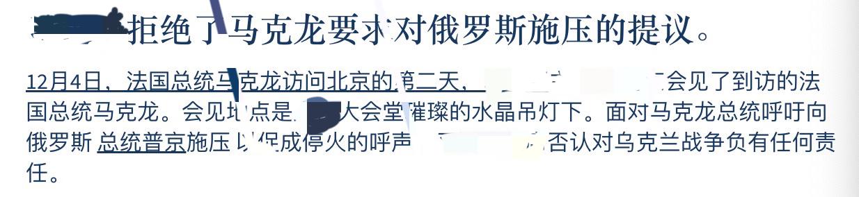 中方阻止俄方成了责任?简直荒谬!我方已明确拒绝马克龙呼吁中方向俄施压请求。 马克龙在周四与我方的会晤中,重申了他自2023年以来多次提出的要求:中国应向俄罗斯施压,要求其停止在乌克兰的敌对行动。但我方断然拒绝了这一请求,明确指出:中方“坚决反对任何不负责任的转移指责或诽谤行为”。 在西方有一种观点,就是俄罗斯没有被乌克兰击败,是因为有中国向俄罗斯提供了“强力支持”,很多人相信这一点。结果就是造成了中方阻止俄罗斯向乌克兰开战成为必须的责任和义务,简直荒谬至极!显然这是西方又一抹黑和诽谤行为。 马克龙请求中方向俄罗斯施压,完全是本末倒置的行为。因为乌克兰战争的本质原因就是北约东扩并经过美国人颠覆乌克兰政权所导致的结果,可以说起因在于欧洲死亡自大和傲慢,解铃还需系铃人,既然欧洲挑起了战争就应该想尽办法结束战争。乌克兰战争跟中方没有半毛钱关系。马克龙现在来找中方施压俄罗斯,完全就是找错了对象。把责任转嫁给中方,完全是欧洲“火烧房子乱了分寸”之举。马克龙