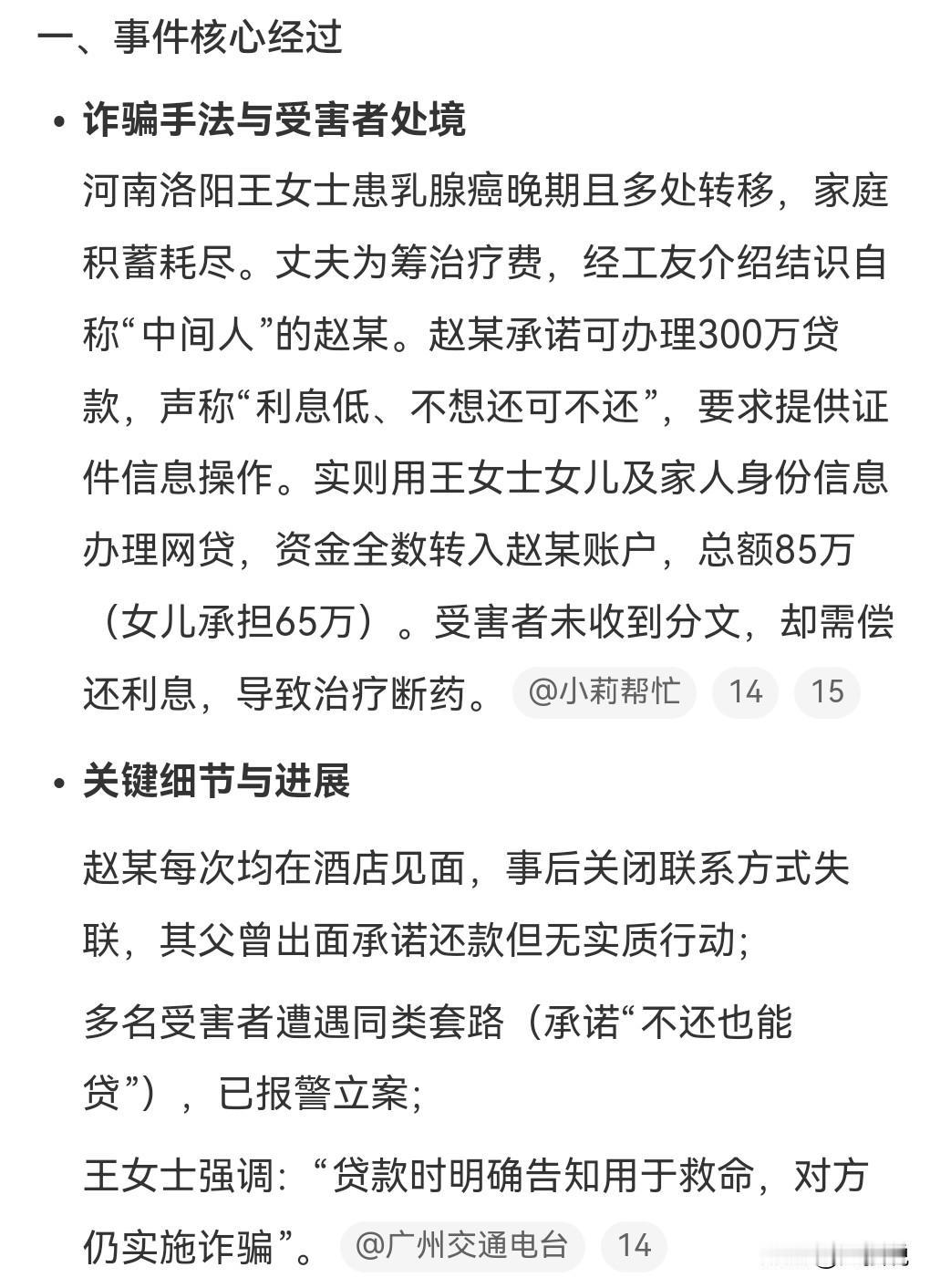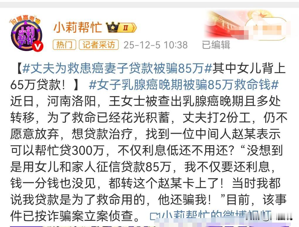 这真的是太相信人了,居然会相信借了钱不用还这样的说法。 那被骗就没办法了。 12月5日媒体发布,丈夫为救患癌妻子贷款被骗85万。 这真是防不胜防啊。 丈夫对老婆是真爱,不惜借钱来治疗,不愿放弃。 骗子实在是太可恶了。 一定要抓住啊,让他付出应有的代价。