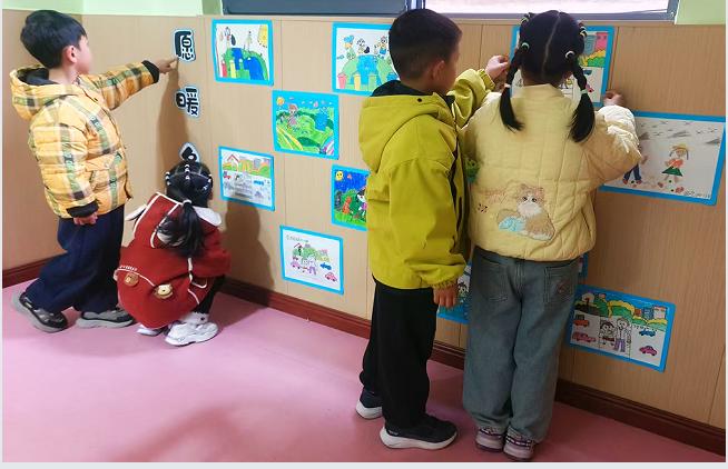 立足幼儿年龄特点,活动设计了层次分明、趣味盎然的实践内容,让每个孩子都能在参与中收获成长。小班亲子家庭组成“环境守护队”,走进社区捡拾落叶杂物、细心擦拭公共设施,更在“垃圾分类小能手”沉浸式体验中,将环保理念转化为看得见的行动,用小手为家园“美容”;中班幼儿化身“温情小使者”,带着亲手制作的贺卡与创意小礼,走进社区孤寡老人和留守家庭,用童真的问候、暖心的陪伴诠释“互助”真谛;大班幼儿则变身志愿精神“小小宣传员”,围绕“‘愿’暖冬日”的主题挥洒画笔,一幅幅充满童趣的作品与电子屏滚动的标语相映成趣,形成立体宣传矩阵,让奉献的种子在园所每一个角落悄然萌芽。