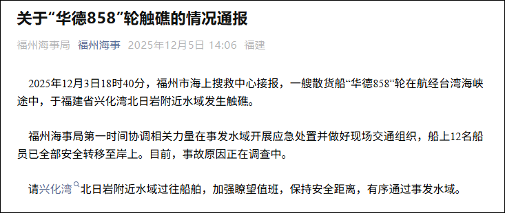 2025年12月3日18时40分,福州市海上搜救中心接报,一艘散货船“华德858”轮在航经台湾海峡途中,于福建省兴化湾北日岩附近水域发生触礁。