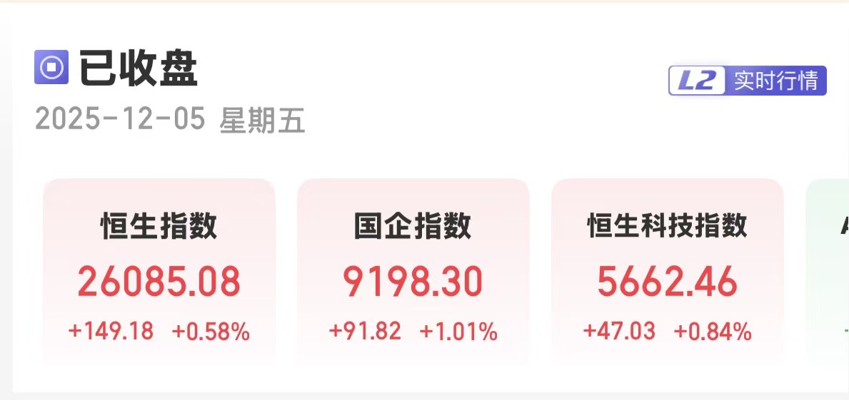 上证报中国证券网讯(卢伊记者严晓菲)12月5日,港股三大指数集体收涨。截至收盘,恒生指数涨0.58%,报26085.08点;恒生国企指数涨1.01%,报9198.30点;恒生科技指数涨0.84%,报5662.46点。