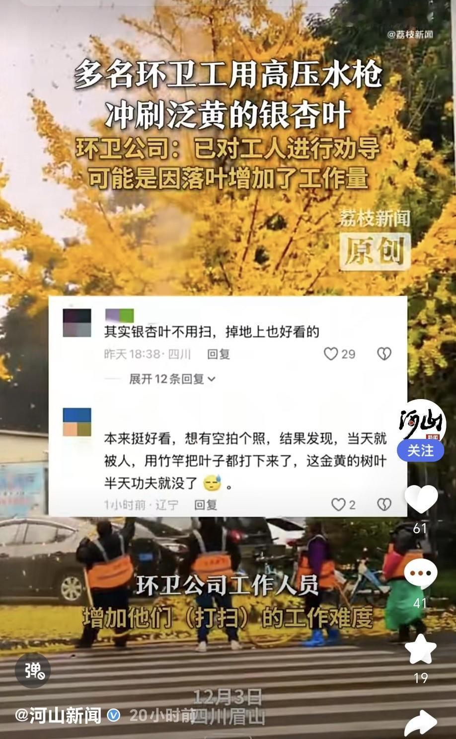 四川眉山多名环卫工用高压水枪打落银杏叶 12月3日网友发视频,说文忠街多名环卫工用高压水枪冲泛黄银杏叶,树叶纷纷掉落。网友觉得既浪费水又破坏美景,这吐槽不无道理,谁不喜欢街边金黄的银杏美景呢。 后续回应更让人摸不着头脑。环卫公司说可能是落叶增加工作量,已对工人教育劝导;环境卫生管理所却称事情不属实,查无此事,还表示不清楚是不是外包公司干的,甚至说没刷到过视频。 A网友:其实我觉得落叶在地上真的挺好看的,为什么城里必须把落叶打扫的干干净净的,可能我是农村人真的不理解。 B网友:不要用扫不干净来处罚人家,不要用落叶来考核,哪来那多事?其实落叶落路面一层挺美的。 C网友:允许银杏落叶人行道不清扫,马路中只要不集堆式飘洒点很正常嘛,自然景观还是挺美的。 D网友:没人踩,当然好看。人踩车压,一会就变成泥巴了。不是环卫工人想这么做,而是不得不这么做,只要路上有落叶,那些不食人间烟火的人就会开始嗷嗷叫,它们眼里路上不能有树叶。 秋冬的落叶很正常,特别是有风的时候,一边扫一边落,根本没必要打扫那么勤快。不要因为清洁工廉价就使劲压榨他们,都不容易。