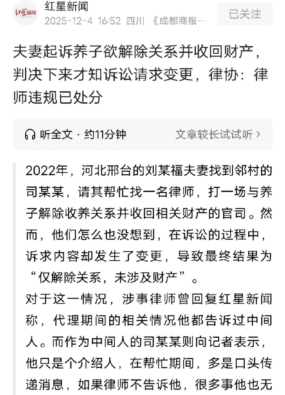 河北邢台,大爷和老伴生病后,养子不闻不问,更过分的是,大爷患癌后他直接拉黑大爷,大爷心寒不已:含辛茹苦养他40年,给他操办3次婚礼,到头来啥没捞着。大爷气不过,找代理律师把养子告上法庭,要求解除父子关系,并让他退还6亩地,一处宅基地,另外还要归还10万抚养费。没想到,律师竟偷偷改了大爷的诉讼请求,最终法院只判决解除关系,无任何财产。大爷怒了,把律师投诉到律协。 1981年的一天,刘大爷的父亲找到他,跟他商量,让刘大爷跟他妹妹交换个孩子来养。 那时刘大爷已经生了5个女儿,而他妹妹家生有多个男孩。 刘大爷也很渴望有个儿子,怎奈他们夫妻俩一连生了5个都是女娃,这让他在村子里头很没面子。 他想着,再生下去指不定还是女儿,而且他们已经有5个孩子了,家里条件本就不好,多个孩子就多份压力。 思来想去,刘大爷接受了父亲的提议,把小女儿送去妹妹家,再把妹妹的小儿子换到他们家,两家交换着养。 刘大爷把养子接回家后,给他上了自家户口,取名刘某坡,从此夫妻俩把刘某坡当亲儿子来养。 之后还分给他6亩地和一处宅基地。 为了不让刘某坡知道自己的身世,刘大爷和妻子尽量不让刘某坡去妹妹家。 可刘某坡却是父母不让去,他偏要去,而且跟姑姑家那边的兄弟姐妹玩得很好。 这让刘大爷和老伴很是担忧,不过该来的总会来。 终于,在刘某坡12岁那年,他无意中得知自己的身世。 刘某坡知道自己不是刘大爷的亲生儿子后,去姑姑家的次数更加频繁,对刘大爷和刘大爷的老伴更加疏远。 刘某坡长大后为了生计,离家打工,从那之后,他就很少回来看刘大爷夫妇。 不过,他谈了女友,需要结婚的时候,倒是带回家给刘大爷夫妻看,还让他们给自己置办了婚礼。 刘某坡有三段婚姻,前面两段婚姻因为各种各样的原因,都离了。 虽然这让刘大爷和老伴很是苦恼,但想到只有儿子成家了,才能给他们刘家开枝散叶,所以两老默默给儿子操办婚礼,结婚三次,婚礼的一切费用,都是刘大爷夫妻俩掏的。 可即便这样刘某坡对刘大爷夫妻俩并没有过多的感恩之情,结完婚就离开家了,出去后几乎不给刘大爷打电话,更没有一句问候的话。 2022年到2023年刘大爷和老伴陆续生病,可出钱又出力的只有自己的5个亲生女儿,养子刘某坡连人影都不见,电话也很少打回来。 2023年,刘大爷查出患癌后,刘某坡彻底联系不上了。 刘大爷的几个女儿说,弟弟哪怕不出钱、不出力,他如果能回来看看父母,让他们开心开心,也值得,但是,刘某坡始终不露面。 刘大爷夫妻俩心寒不已,他们把最好的都留给儿子,可在身边尽孝的却是女儿。 刘大爷气不过,决定跟刘某坡解除父子关系,可他们两老读书少,没文化,又不知道该怎么办。 于是,刘大爷找到了同村的司某,让他帮忙找律师,告到法院,要求除了解除父子关系外,还要求刘某坡退还6亩地、一处宅基地,另外还要归还10万元抚养费。 2022年,司某找到了律师李某军,把刘大爷的诉求告诉李某军。 李某军按照刘大爷的诉求整理好材料,跟刘大爷确认,刘大爷夫妻在确认后给李某军支付了8000元律师费。 从那之后,刘大爷夫妇再也没有跟李某军见过面,有任何问题均是司某在中间传达。 直到2024年1月19日,刘大爷一家才得知,与刘某坡的官司有了结果,其实早在2024年1月3号的时候已经出了判决结果,但是刘大爷一家却一直没收到通知。 2024年11月份,刘大爷让女儿前往法院查看卷宗,她们看到了“变更诉讼请求书”。 上面写道,因为刘某坡不赡养、还找不着人,他们就只要求解除关系,不再要赡养费。 刘女士说,这份变更申请和后来的上诉状都是律师伪造的。 她爸妈根本没说过不要赡养费,等他们知道判决结果时,早就过了上诉期,事儿卡在了那。 之后他们找律师,律师说已经跟司某讲清楚了。 但,司某却说自己只是传话,不知道律师改了诉状。 之后刘大爷夫妻向律协举报了李某军,他只退了6000块律师费。 最终,律协查明律师有私自收案、没签合同、擅自改文书等违规行为,给了他公开谴责的处分,律所也被通报批评。 但刘大爷女儿不接受,要求吊销他的律师执照、并赔偿损失。 那么,刘大爷女儿的诉求能否得到支持呢? 《律师法》第54条规定,律师违法执业或者因过错给当事人造成损失的,由其所在律师事务所承担赔偿责任,律所赔偿后可向有故意或重大过失的律师追偿。 本案中,律师李某军私自收案、未签合同且擅自变更诉讼请求,属违法执业且存在重大过失,导致刘大爷财产诉求未获支持,刘大爷可要求律所赔偿损失。 同时,李某军违规情节严重,刘大爷女儿要求吊销其执业证书的诉求,可向司法行政机关申请,符合《律师法》对严重违规律师的处罚精神,具有法律依据。 养子忘恩负义真是寒了养父母的心,律师违规操作更添伤害,只盼着大爷早日讨回公道,别让老实人吃亏! @猫眼学法