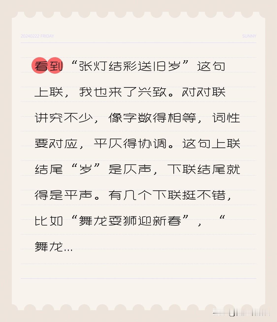 看到“张灯结彩送旧岁”这句上联,我也来了兴致。对对联讲究不少,像字数得相等,词性要对应,平仄得协调。这句上联结尾“岁”是仄声,下联结尾就得是平声。 有几个下联挺不错,比如“舞龙耍狮迎新春”,“舞龙耍狮”和“张灯结彩”都是节日热闹场景,对仗工整,很有过年氛围。还有“欢天喜地迎新春”,经典又适配。“举杯同庆启新篇”也挺好,有生活化场景。感觉对对联就像搭积木,把字词巧妙组合,乐趣无穷。