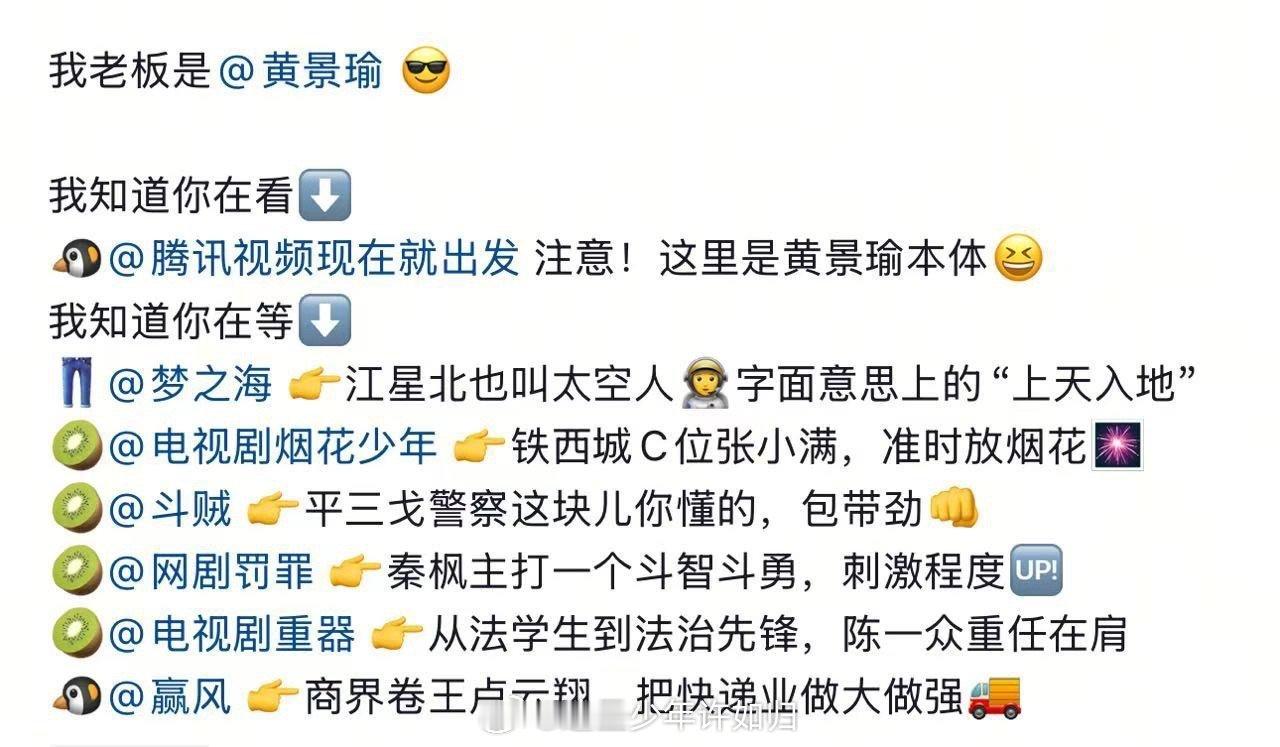 黄景瑜想清清存货了 观众和黄景瑜达成共识:存货该清了!从仰望星空的飞行员到接地气的市井青年,从硬汉警察到成长型律师,再到商界精英,他挑战的角色多样,涉猎题材广泛。这份高质量的“存货”清单,值得我们翘首以盼!