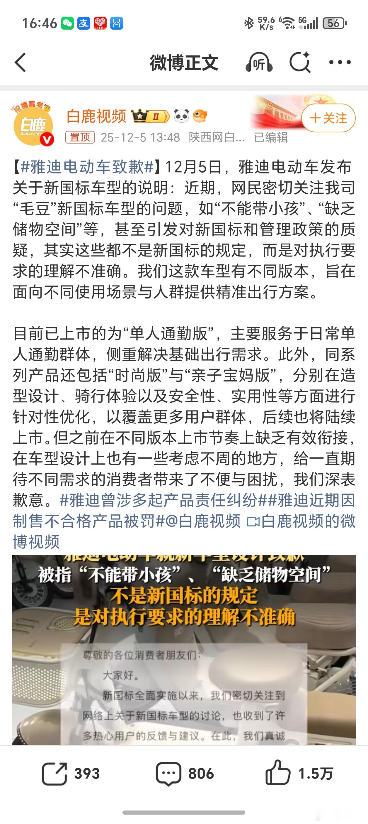 雅迪电动车致歉后续将推出时尚版、亲子宝妈版覆盖更多需求,还会优化产品与服务。 前
