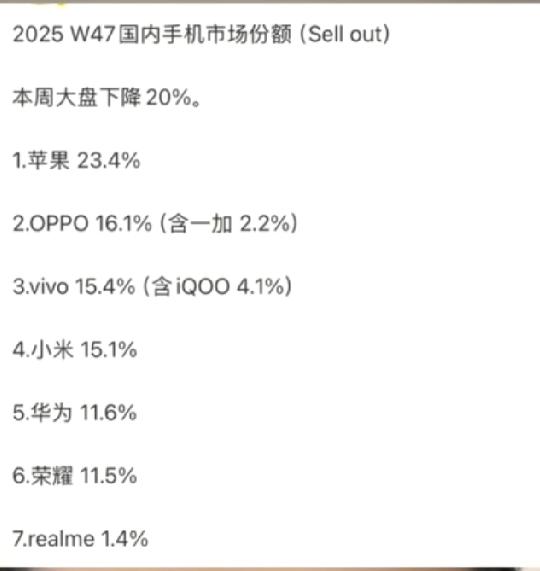 国内手机市场份额近两周的对比。 1、苹果还是排名第一,但是掉了近6%的市场份额。 2、华为从排名第五跃升到了第二,市场份额提高了6.4%。 3、vivo、oppo市场份额都有小幅的下滑,但几乎可以忽略不计。 4、荣耀市场份额有2%的提升,这个成绩对于荣耀来说可以说非常不错了。 5、小米市场份额再次被蚕食,已经从17上市时的排名第二掉到了第六,市场份额一周又掉了1.5%。 对手机市场的份额之争,大家怎么看?