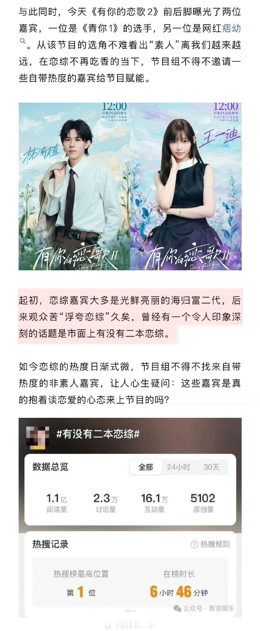 恋综是通往娱乐圈的大门吗业内谈恋综选角标准 北电毕业生王梓莼自封“00花”上恋综遭吐槽,《有你的恋歌2》直接邀青你选手+网红痞幼,素人含量越来越低,恋综还能体现普通人的恋爱吗?