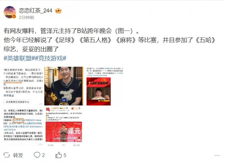 妥妥的出圈了?网友爆料:今年B站跨年晚会主持人为LPL解说管泽元
