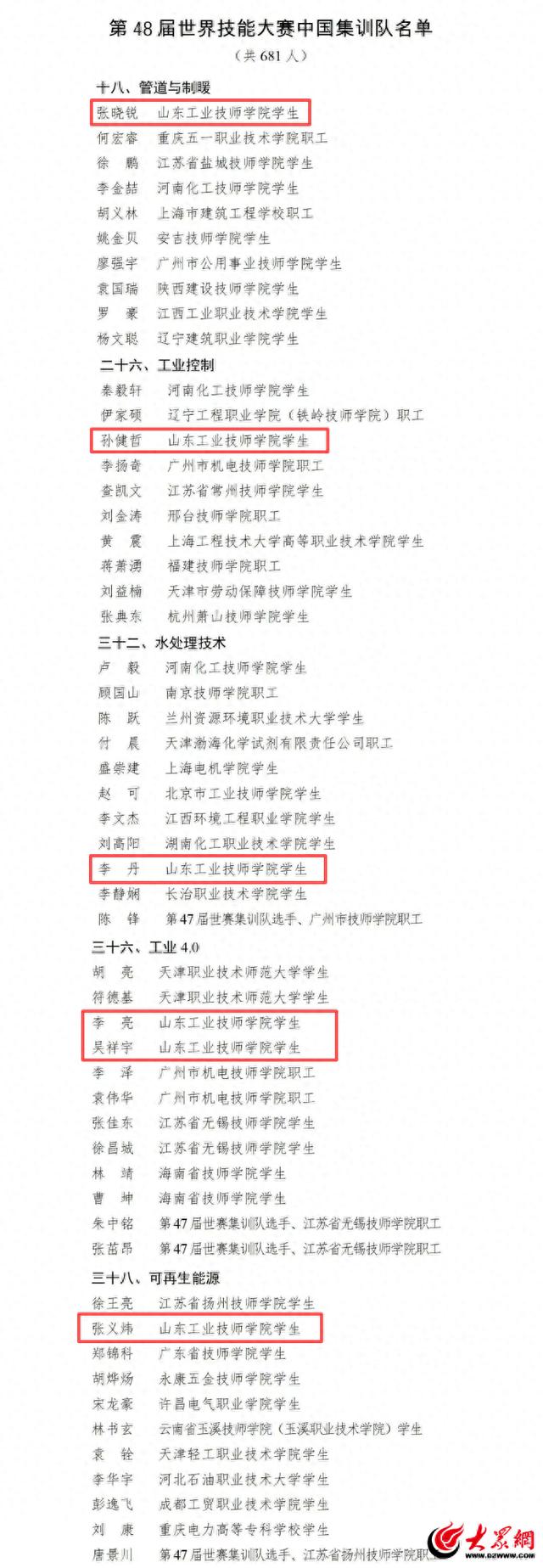近日,人社部印发《关于公布第48届世界技能大赛中国集训队名单的通知》,山东工业技师学院6名学子入选世赛国家集训队。
