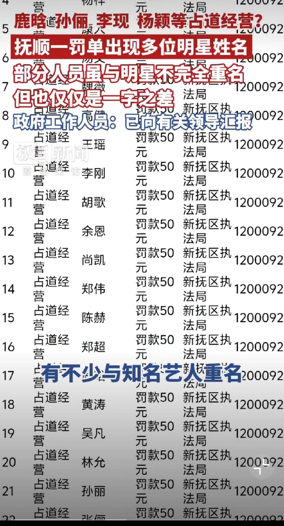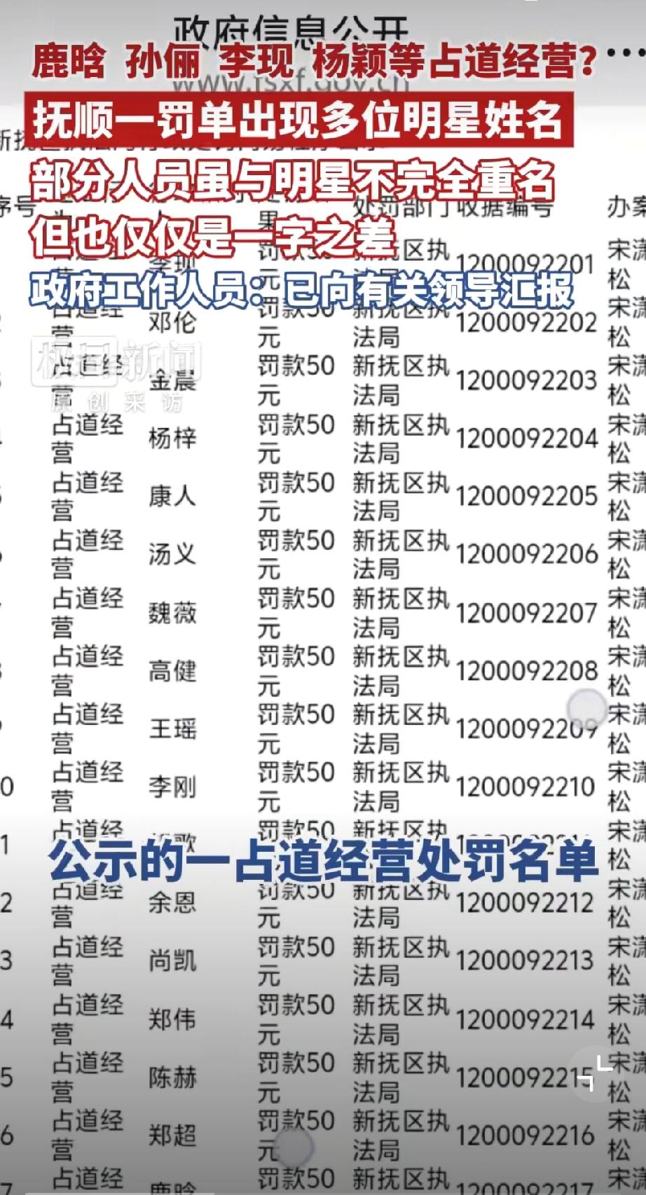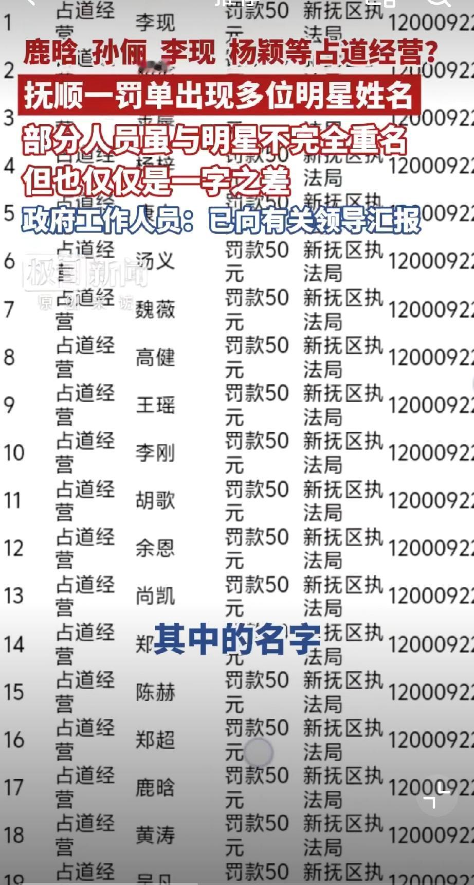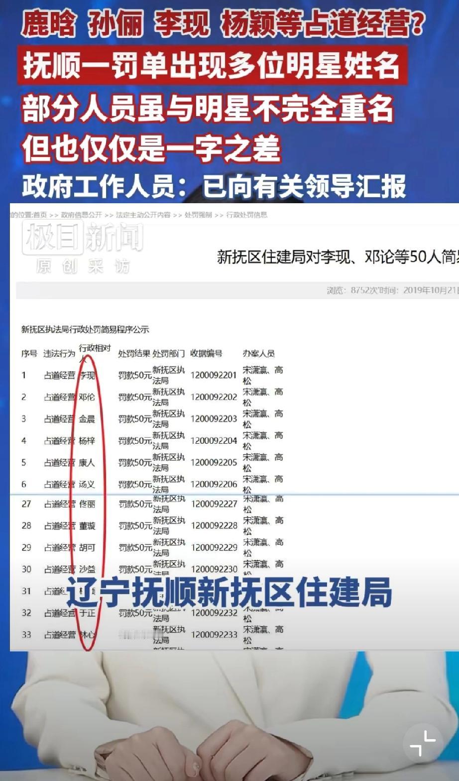 多个明星姓名上住建局罚款名单,抚顺新抚区:已成立调查组核实。,新抚区住建局2019年10月21日发布了对50人占道经营的简易程序罚款公示,其中包括李现、金晨、胡歌、鹿晗、陈赫等多个明星名字;还有疑似将明星艺名删字后列在该名单上的情况,如佟丽、林心、任贤、范冰、林志等。