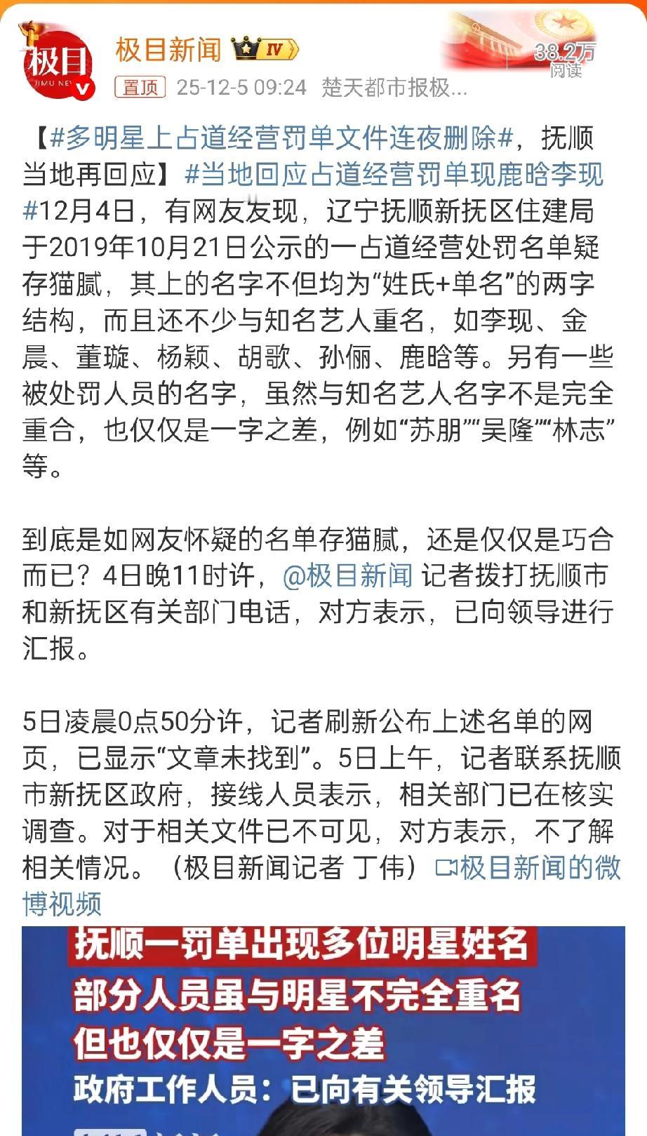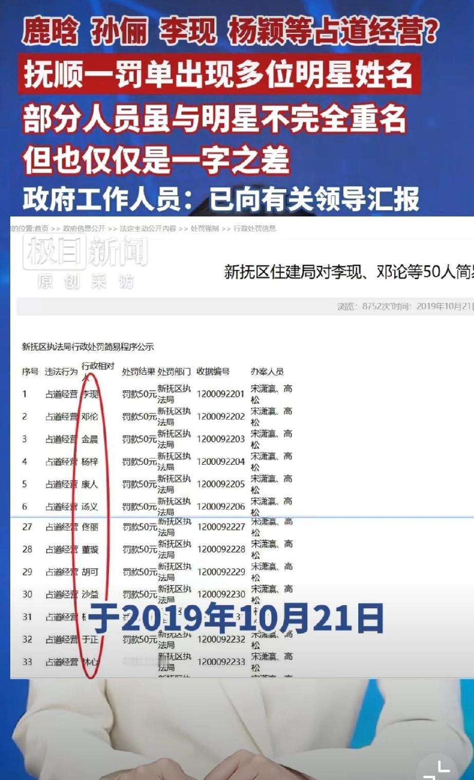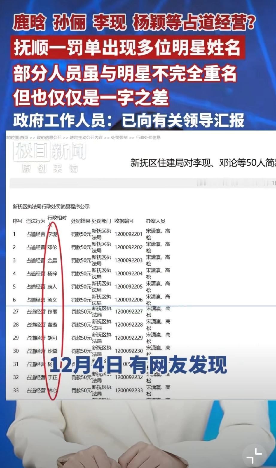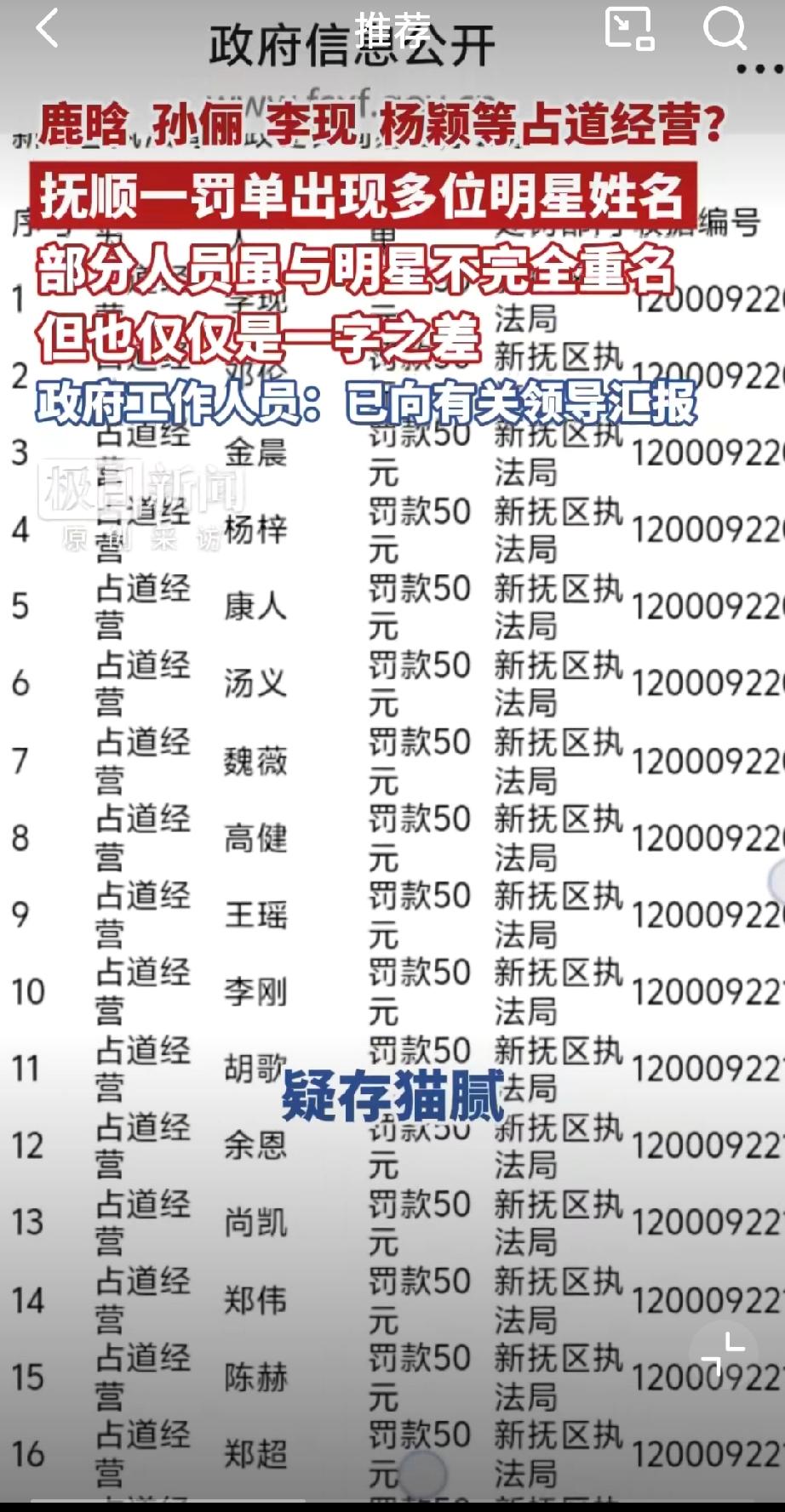 多个明星姓名上住建局罚款名单,抚顺新抚区:已成立调查组核实。,新抚区住建局2019年10月21日发布了对50人占道经营的简易程序罚款公示,其中包括李现、金晨、胡歌、鹿晗、陈赫等多个明星名字;还有疑似将明星艺名删字后列在该名单上的情况,如佟丽、林心、任贤、范冰、林志等。