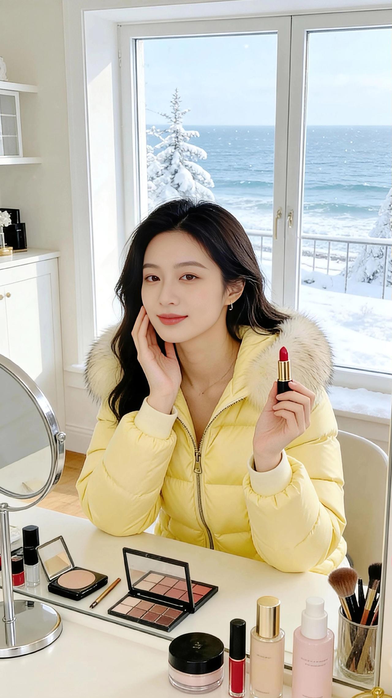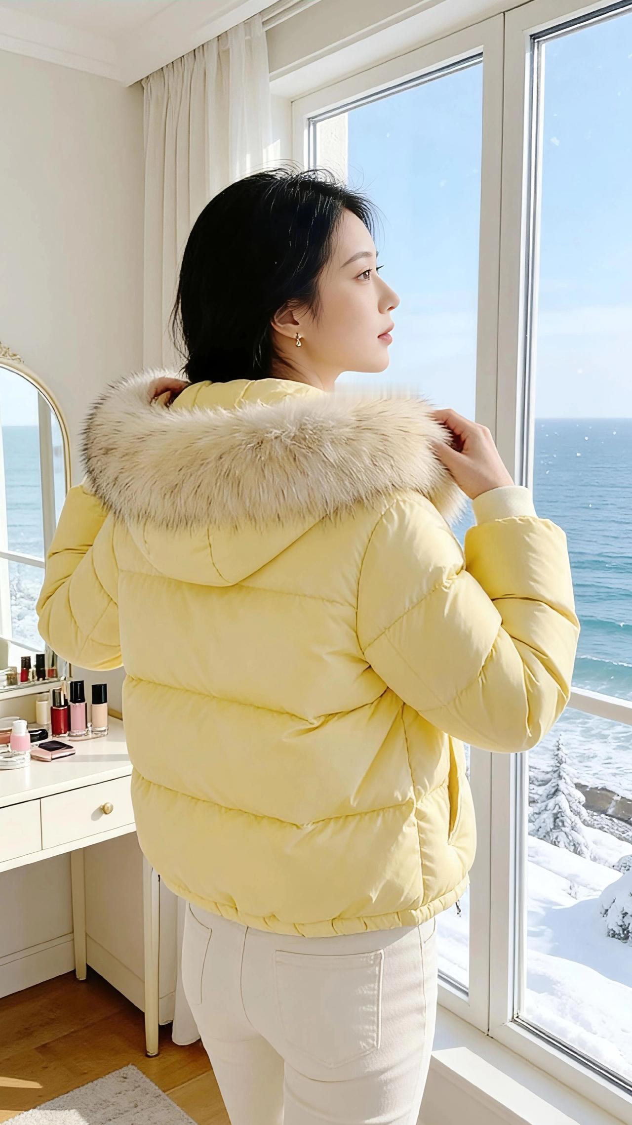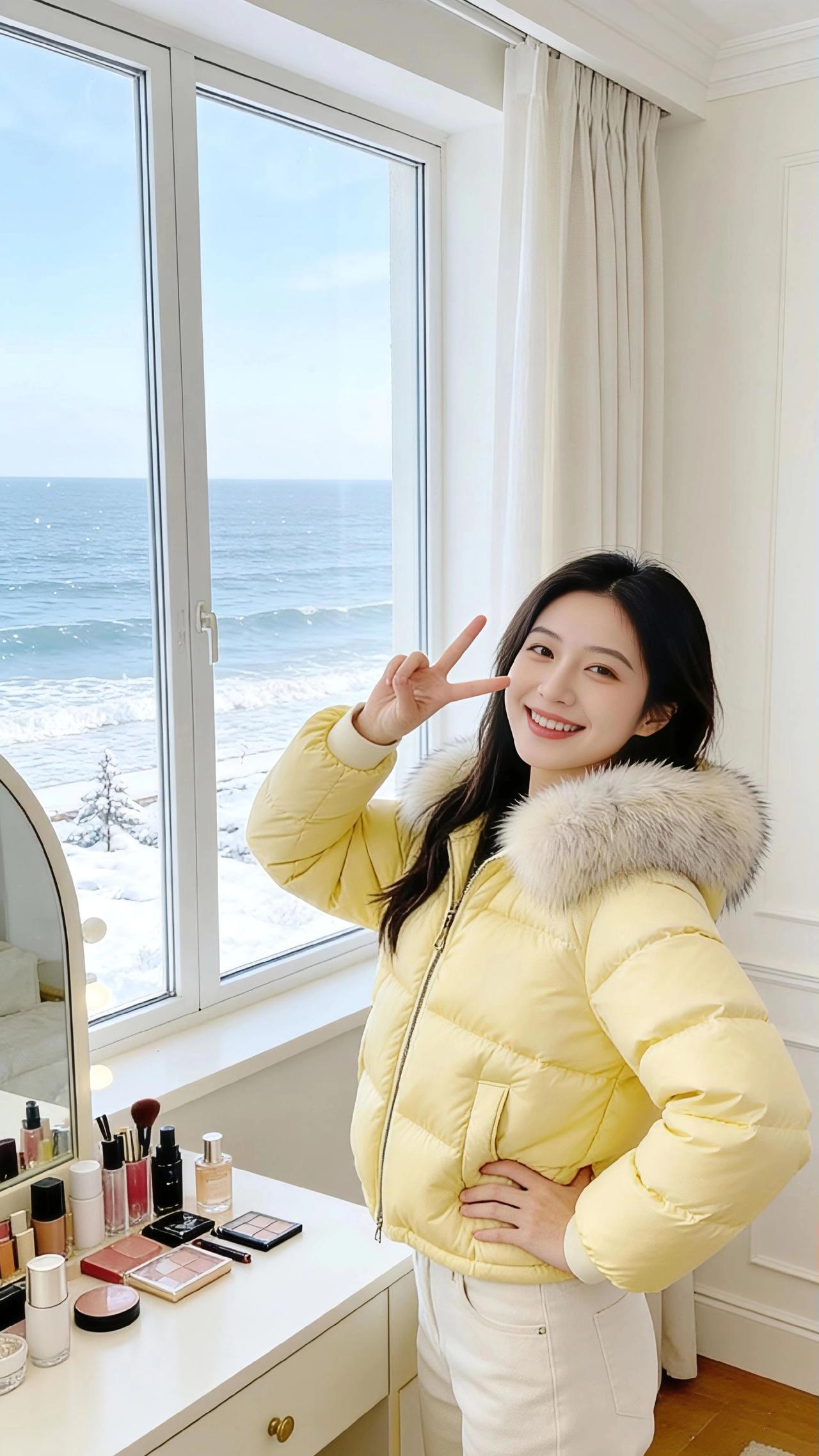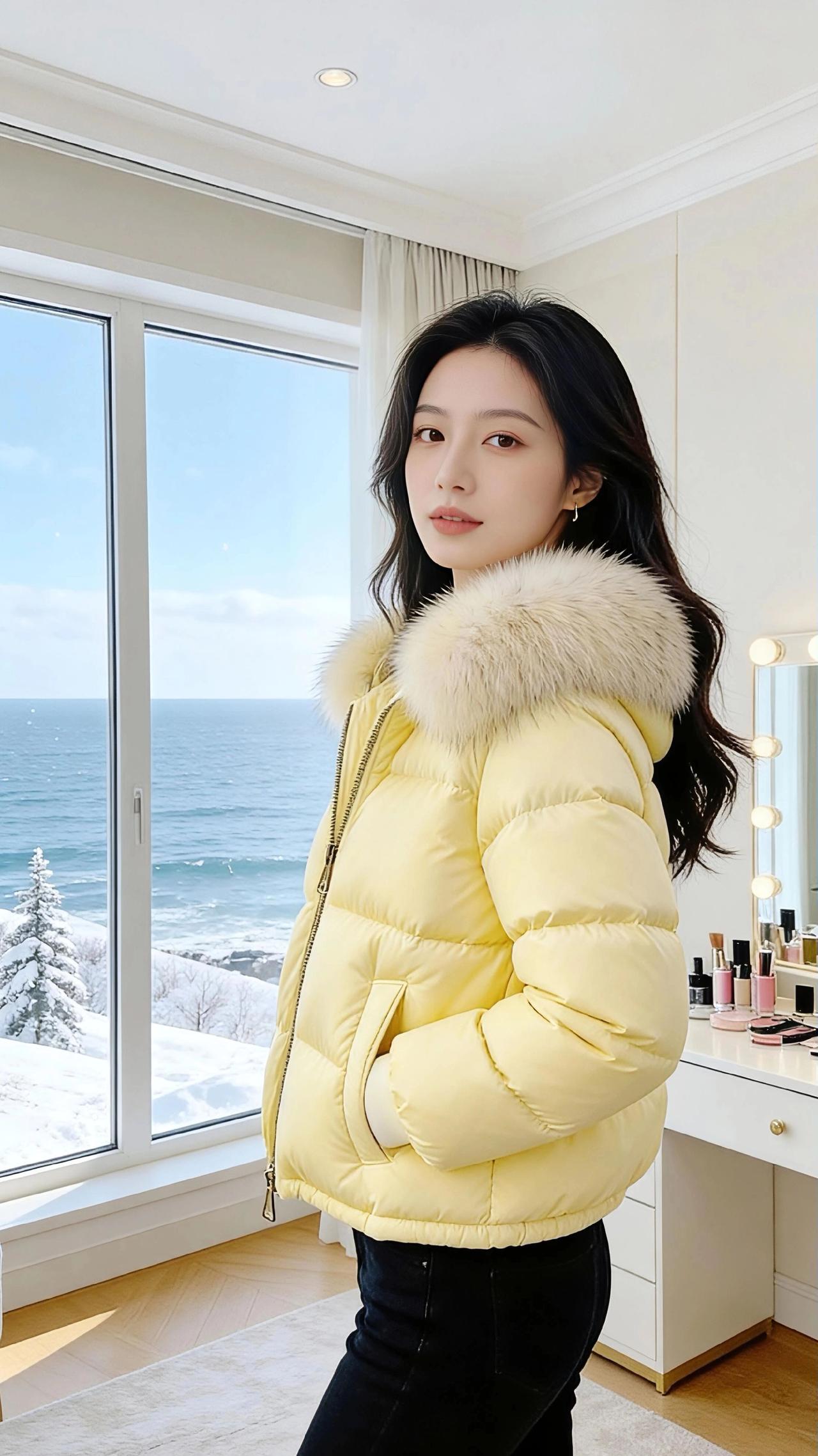 《冬海与鹅黄》 冬日的海是静的,雪絮裹着松枝往浪尖落,碎成一捧冷的星子。海景洋房的窗敞着光,把梳妆台浸得温软——脂粉的香混着羊绒地毯的暖,裹住那团鹅黄的软。 她裹着那件带毛领的羽绒服,绒絮是浅雪的颜色,衬得鹅黄像揉碎的冬阳。有时站在镜前比个轻俏的“V”,指尖碰着毛领的软;有时侧过身理领子的弧度,发梢擦过窗沿的光,落在雪海的背景里,像帧慢下来的画。 坐到梳妆台前时,她捏着支口红,指腹蹭过膏体的红。窗外是浪拍雪岸的清寒,室内是暖光裹着的松弛——她偏头笑时,羽绒服的褶皱里落满了甜,连风穿过窗缝,都沾了点脂粉的软。 原来冬也可以这样:冷的海与雪作了背景,暖的光与黄作了衣裳,她站在其间,是这季里最软的那缕风。 高级感穿搭 小个子穿搭