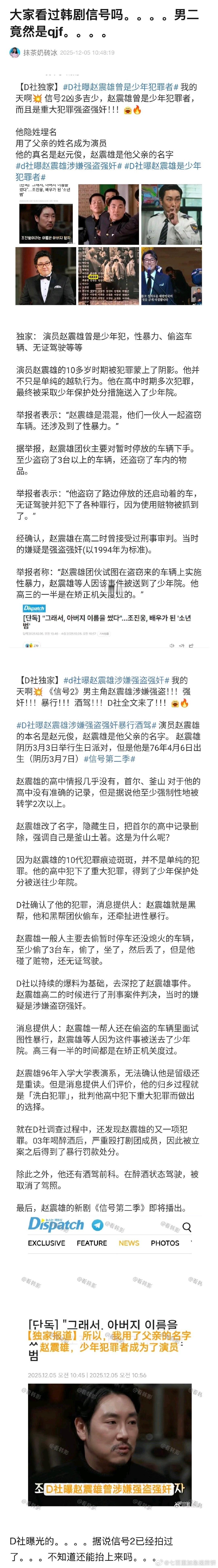 信号2男主角赵震雄94年性/侵女高中生的新闻被曝光,我的妈啊…他本名为赵元俊,使用父亲姓名作为艺名,在十多岁当混混时期,至少偷过 3辆以上的汽车;屡次用高级车引诱少女,和多人一起对受害者进行性暴力,并且抢走受害者的钱,甚至有一次性暴行之后 发现女方没有钱,直接以女方为人质,去她家拿钱。高二时以“强盗强奸”罪名被少年保护处分并送进少管所;当剧团演员时期喝酒后殴打同伴,之后因暴行被立案;烂醉状态下酒驾,被吊销驾照。经纪公司回应:“确认事实后发表立场。”