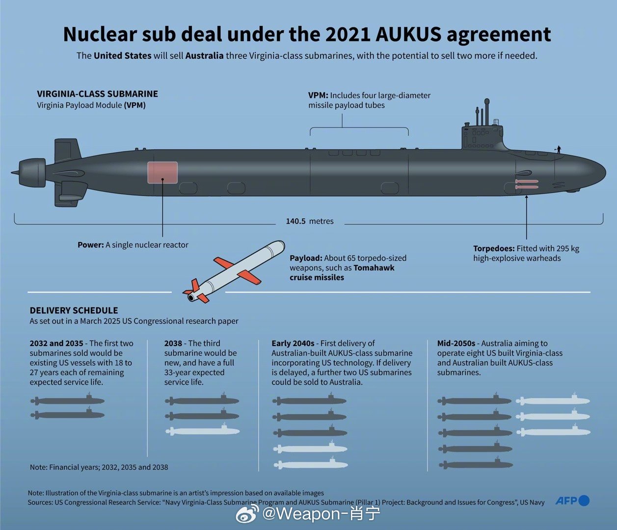 烽火问鼎计划每天认识一件兵器 美国五角大楼周四表示,已批准与英国和澳大利亚签署的三方安全协议“奥库斯”(AUKUS),该协议将涉及堪培拉在15年内获得至少三艘弗吉尼亚级核潜艇。今年早些时候,唐纳德·特朗普政府表示,正在审查其前任总统乔·拜登在2021年签署的核动力攻击潜艇协议。国防部完成了为期五个月的审查,审查结果认可了 AUKUS 协议,并认定该协议“符合特朗普总统的‘美国优先’议程”,五角大楼发言人肖恩·帕内尔在一份声明中表示。“根据特朗普总统关于 AUKUS 应该‘全力推进’的指示,此次审查发现了使 AUKUS 处于尽可能强势地位的机会。”美国众议院海权小组委员会首席民主党议员乔·考特尼表示,审查的完成确保了该条约的“框架符合我们国家的国家安全利益”。“值得注意的是,2021 年 AUKUS 协议的达成,使得该协议在三个国家的三次政府更迭中都得以保留,并且仍然有效。”考特尼是国会中AUKUS的积极倡导者,她所代表的康涅狄格州选区是美国主要的潜艇制造厂所在地。《奥库斯条约》旨在使澳大利亚拥有一支来自美国的尖端潜艇舰队,并就开发一系列作战技术开展合作。这些潜艇将于 2032 年开始出售,它们是澳大利亚提高其在太平洋地区(特别是针对中国)远程打击能力战略的核心。这项交易可能在未来 30 年内花费堪培拉高达 2350 亿美元,并且还包括未来建造自己的船舶所需的技术。澳大利亚国防工业部长帕特·康罗伊周五表示,他对美国的审查结果感到高兴,该审查证实了 AUKUS 项目正在“全力推进”。“我们将积极参与讨论其调查结果和建议,以进一步改进 AUKUS。”康罗伊表示,是否公开这份文件由华盛顿方面决定。 “我们目前正在进行审查,过去两年里我们也公开表示,如果可以改进交付方式、提高 AUKUS 的性能,我们一定会去做。”康罗伊说,AUKUS 是一项“动态协议”。“至少还会持续30到40年。我们会看到变化,会看到改进。”2021 年,澳大利亚与法国发生了一场重大冲突,当时澳大利亚取消了一项价值数十亿美元的从巴黎购买柴油动力潜艇舰队的交易,转而选择了 AUKUS 计划。