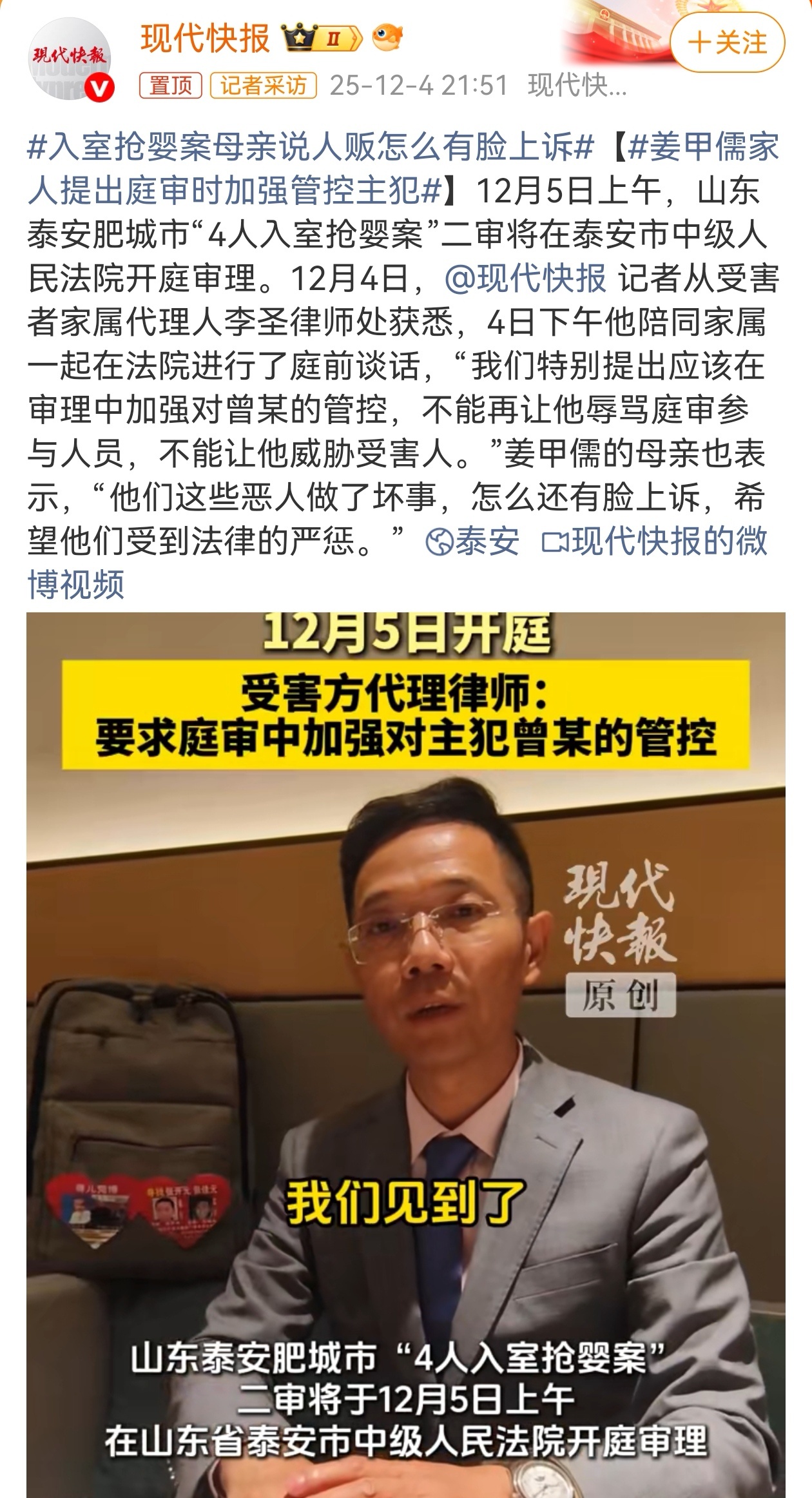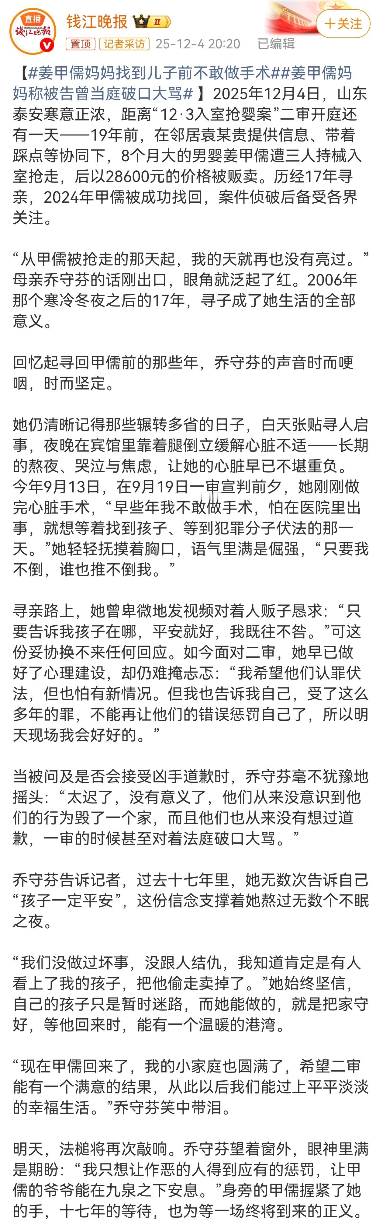 12月5日,“泰安入室抢婴案”二审开庭。庭前,被抢孩子姜甲儒的母亲乔守芬称,已掌握被告此前未被披露的犯罪新证据,并找到与本案有相似遭遇的其他被害人,相关证据“极有可能推动案件并并案处理”。如果证据链被法院采纳,“被告人及其全部同伙的最低量刑标准将为死刑立即执行”。入室抢婴案母亲说人贩怎么有脸上诉入室抢婴案律师称将全力钉死罪犯此外,姜甲儒母亲透露:一审宣判时,主犯曾某孩当庭对他们和法官破口大骂,态度极其嚣张。得知曾某孩、袁某贵两名被告人提起上诉后,乔守芬公开质问,人贩子怎么有脸上诉。我国法律明确规定犯罪嫌疑人、被告人享有上诉权,这是宪法和刑事诉讼法赋予当事人的基本诉讼权利,也是“二审终审制”的核心内容,与案情恶劣程度、社会舆论或被害人情绪无关。上诉权是刚性程序权利,即便是社会舆论谴责的“人贩”,都可以依法行使。 2006年10月出生的姜甲儒,是山东泰安肥城市王庄镇后于村人。2006年12月3日凌晨,8个月大的姜甲儒在家中被4名闯入者入室抢走,逃窜时还把大门反锁,邻居袁某贵因熟悉姜家情况,提前向作案者提供“家中只有老人”等线索,事后获酬金,姜甲儒随后被以2.86万元的价格拐卖至外地。随后的17年,母亲乔守芬与丈夫自此踏上漫长寻子路,跑遍全国20多个省份,多次在直播间、寻亲大会发放海报,与郭刚堂、解清帅等寻亲家庭互相打气。2024年1月,在警方“团圆行动”与DNA比对下,17岁的姜甲儒终于在山东被找到,母子首次认亲,同年2月回姥爷家举办团圆宴。2025年4月2日、9月19日,泰安中院一审公开审理并宣判:曾某孩死缓,吕某东、王某勇无期,袁某贵15年,附带民事赔偿20万元。一审后,曾某孩等提出上诉;姜甲儒一家则申请抗诉,并在二审前提交“可能还有其他被拐孩子”的新线索,要求严惩。姜甲儒被找回时,已是一名高三学生,为出庭作证曾短时间减重28斤,他公开表示希望被告人被判处死刑,“只有得到真正的审判,我才会去告诉爷爷”。母亲乔守芬因多年奔波、精神创伤,一审宣判后一度晕厥,但仍坚持出庭,誓言“让坏人得到应有的惩罚”。入室抢婴案母亲说人贩怎么有脸上诉